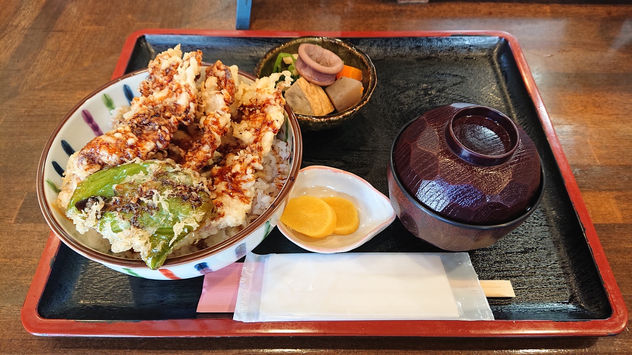 ランチタイムに訪問。4種類のメニューの中から、豚天丼を選択して注文しました。実際に食べてみると、衣はサクサク、肉も結構なボリュームで、豪快な天丼だと感じました。さらに、副菜として出された煮物も適度な味付けでおいしく、全般的に満足でした。