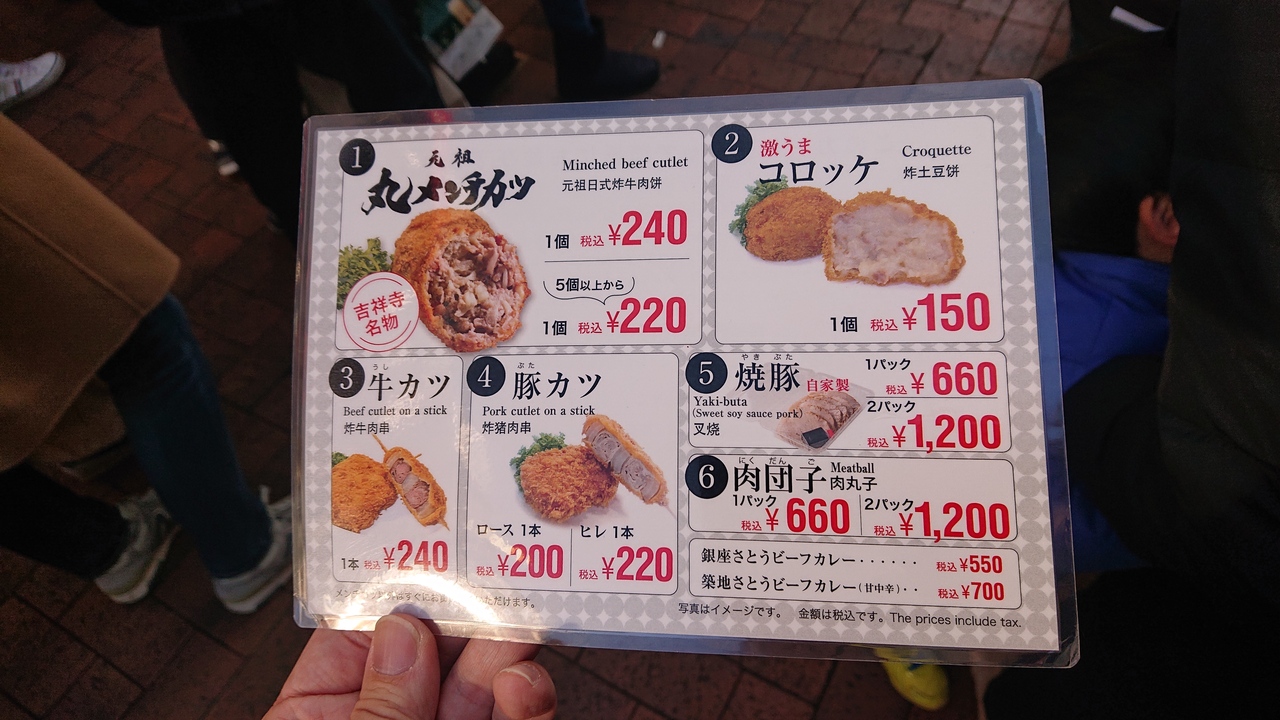 数十年にわたり、吉祥寺で人気店の地位を保っているお店です。今回の訪問時にも行列ができていました。そして、こちらのお店の看板商品が、今回購入した、丸メンチカツ。特に購入してすぐにはとてもジューシー。それゆえ、持ち帰りの人のみならず、その場で食べる人も結構見受けられます。肉の旨味を感じつつ、おいしくいただけました。