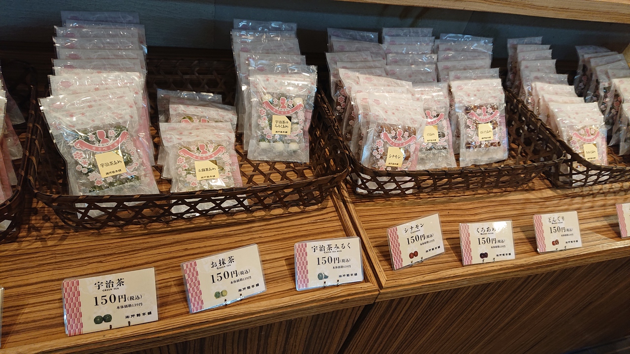 三条大橋近くの京飴の専門店です。店内に一歩立ち入ると、飴が所狭しと並べられていました。種類も豊富ですので、選ぶ楽しみがありました。迷った末に、飴数点を購入。特に印象に残ったのは、お抹茶飴。中に抹茶の粉が入っており、飴を食べ進めると粉が出てくるというユニークさがありつつ、味も良かったです。