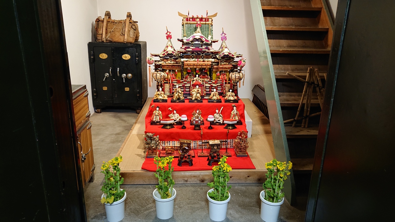 足助の春を彩る、恒例イベント、「中馬のおひなさん」、の開催期間中に訪問しました。よって、こちらの施設にも、当然に、ひな人形の展示がなされていました。ひな人形も素敵でしたが、雛壇の前に、さりげなく花が飾られているのも良かったと思います。