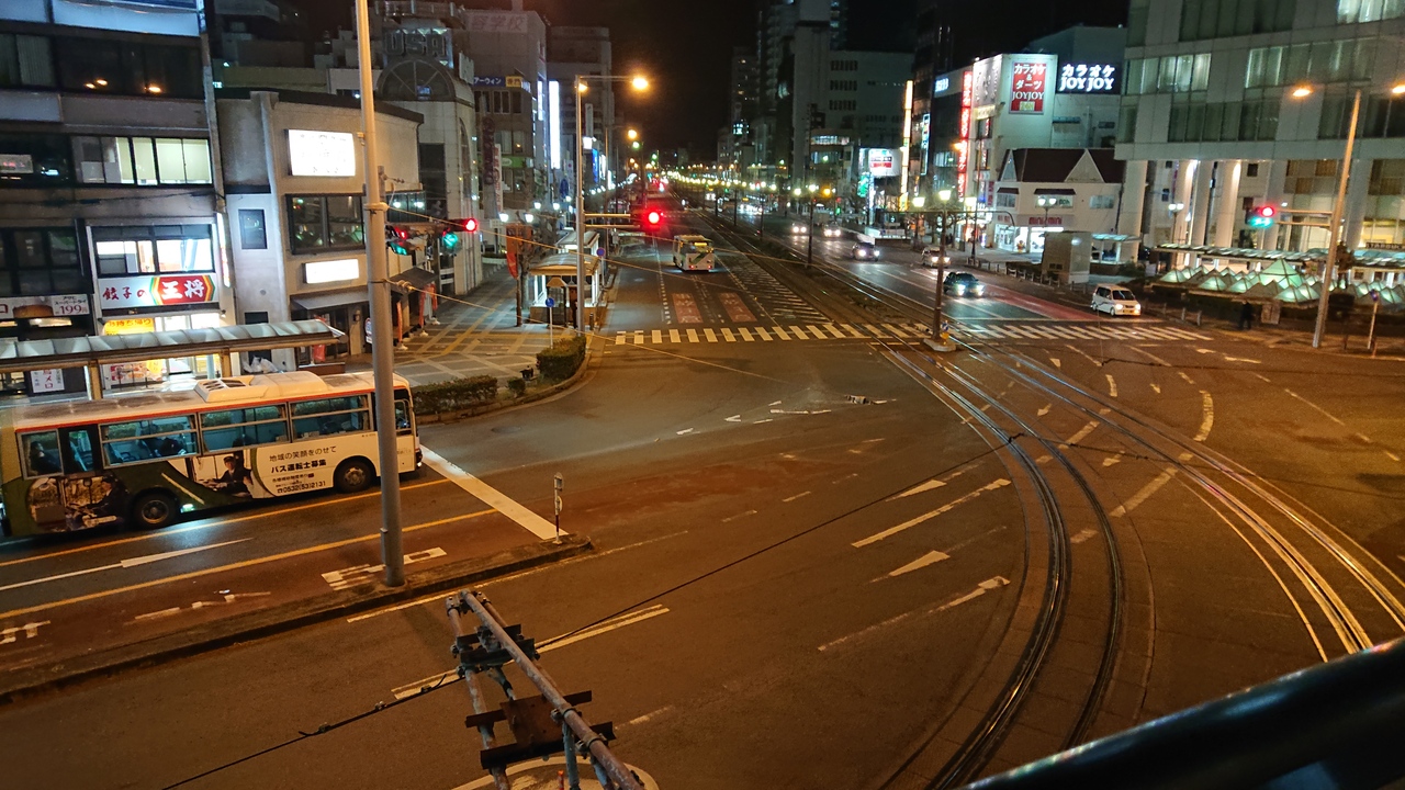 2月上旬の20時台に訪問しました。車線に加えて、路面電車の線路がありますので、かなり広い通りだと改めて実感しました。その広い通りを、バスや車が、絶え間なく行きかっており、まさに、豊橋の交通の大動脈と言える通りだと思いました。