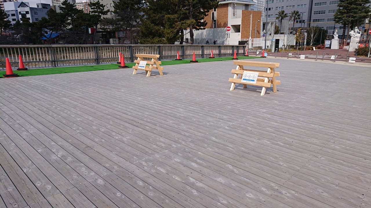 2月上旬に訪問しました。霜の降りる時期で、材質が木の当橋は、滑りやすいといえます。そこで、通行の安全に配慮して、橋の片方の端側に、人工芝が引かれていました。観光の目玉にと造られた橋ではありますが、通行にも配慮しているというのは、結構なことだと思いました。