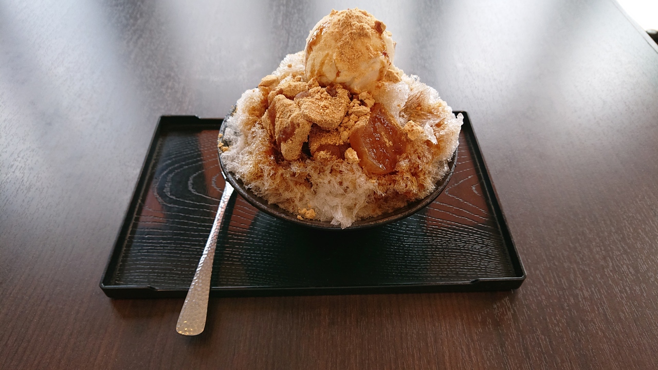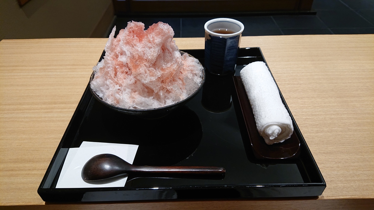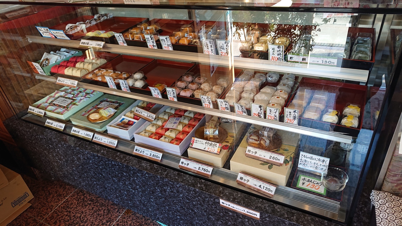 桂新堂本店2階の喫茶スペースです。(なお、喫茶スペースというのは、私個人による見解です)。店内には、伊勢海老の工芸菓子が飾られている等、煎餅が本業の桂新堂さんが運営するお店らしさが全開でした。あまおう味のかき氷を、おいしくいただくことができました。