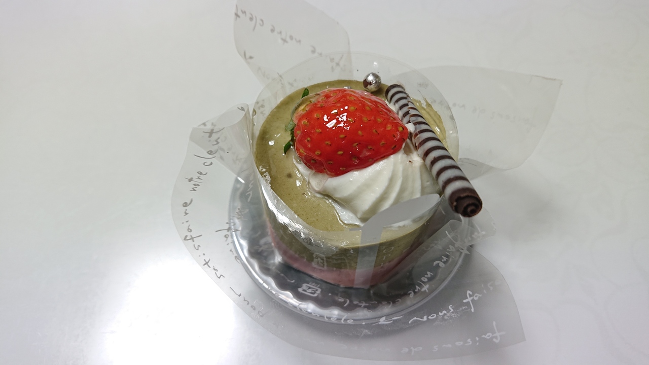フレーズピスタージュを購入しました。内容としては、ピスタチオとイチゴのムースが二層になったスイーツでした。ピスタチオのビターさと、イチゴの酸味が生かされており、かなり個性的な味わいだと感じました。大人向けのスイーツと言えると思います。