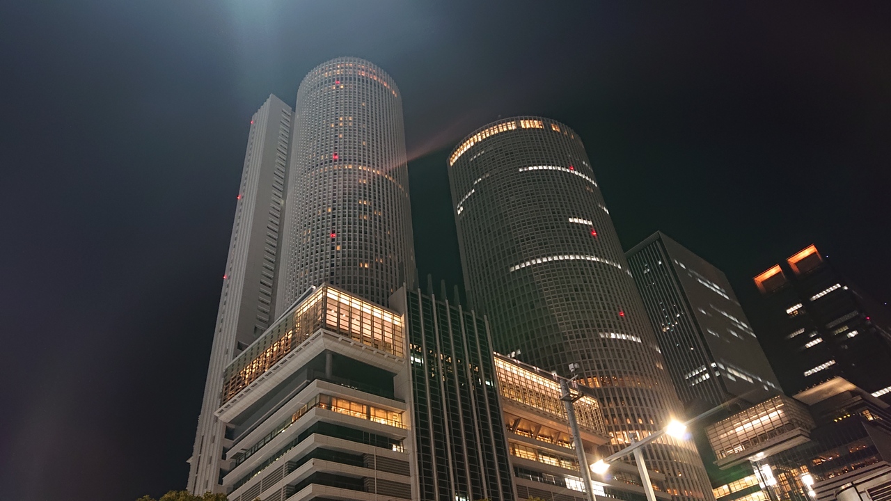 1月中旬の週末の午後6時台に訪問しました。そして、ミッドランドスクエア側から、「スパイラルタワーズ」を眺めました。使用中と思われる部屋の窓から漏れる灯りが、良い雰囲気を醸し出しており、昼間とは違った姿が見られ、良かったです。