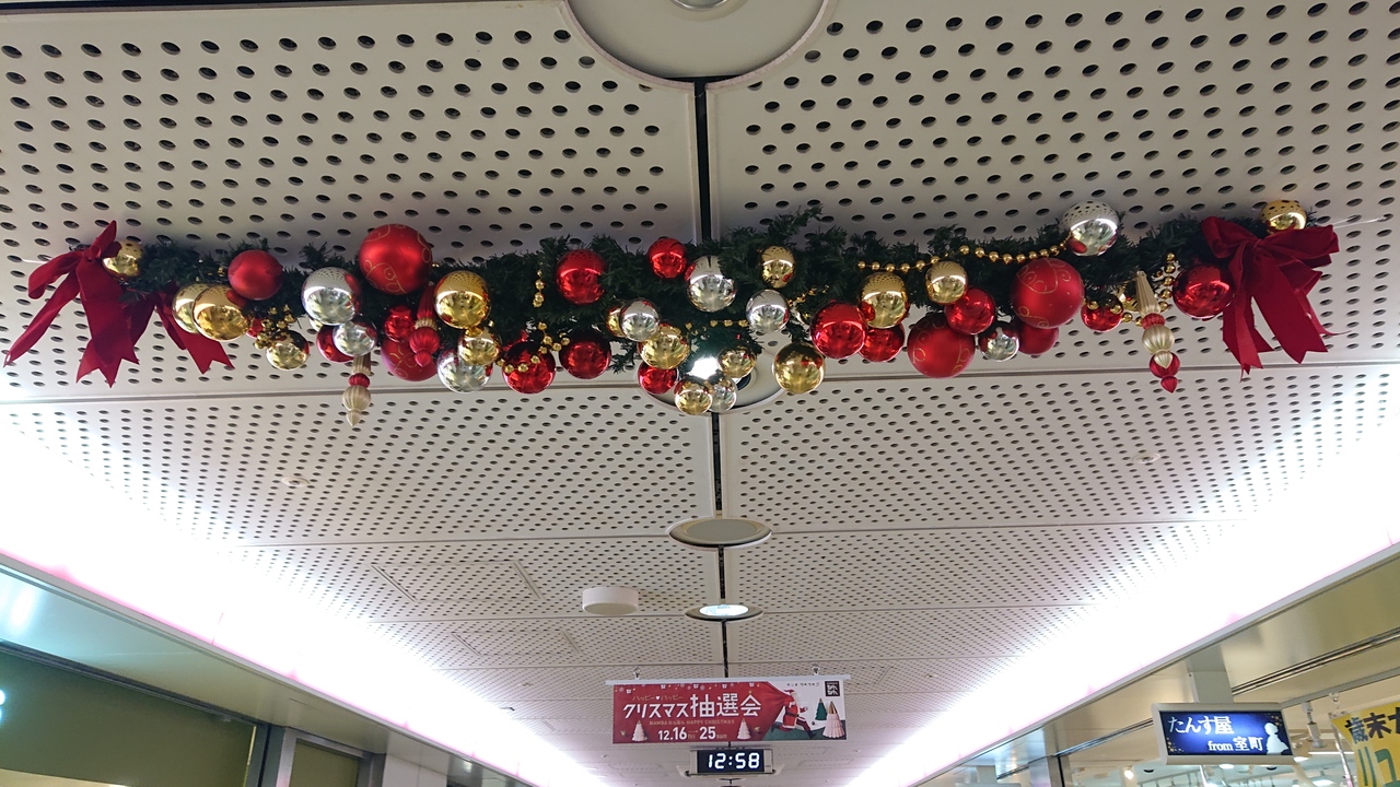 大阪メトロ御堂筋線からスグの位置に立地する、地下街です。12月下旬の平日の午後1時頃に訪問しました。地下街内は、お客さんで賑わっていました。今回の訪問で特に印象に残ったのは、天井のクリスマス装飾。華やかで良いな、と感じました。