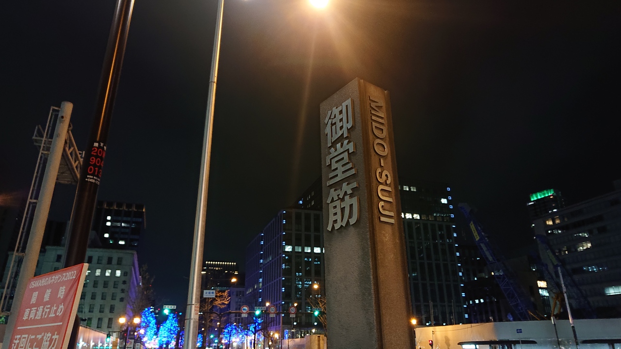 12月下旬の平日の夜9時台に、淀屋橋駅から程近い付近の御堂筋を訪問しました。そして、イルミネーションを眺めました。御堂筋沿いの木々に、青色を中心に、電飾が施されていました。それが、冬の夜に映えており、綺麗でした。