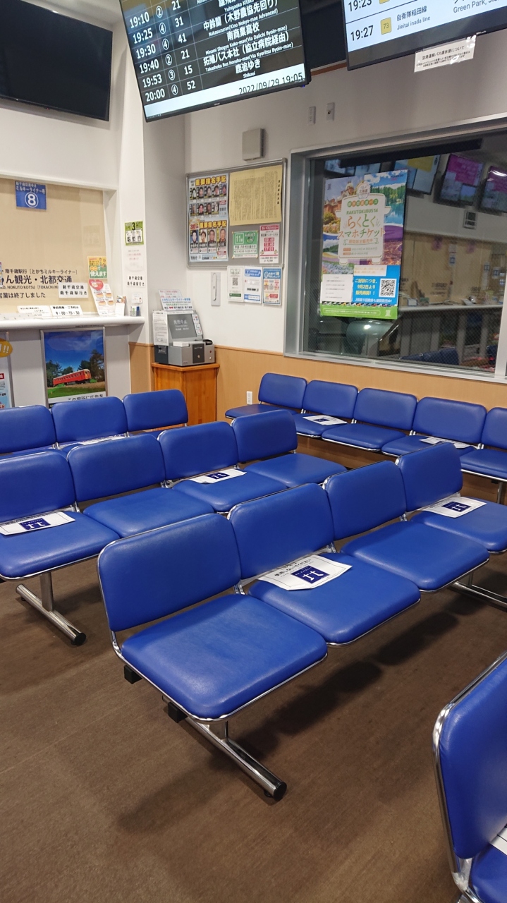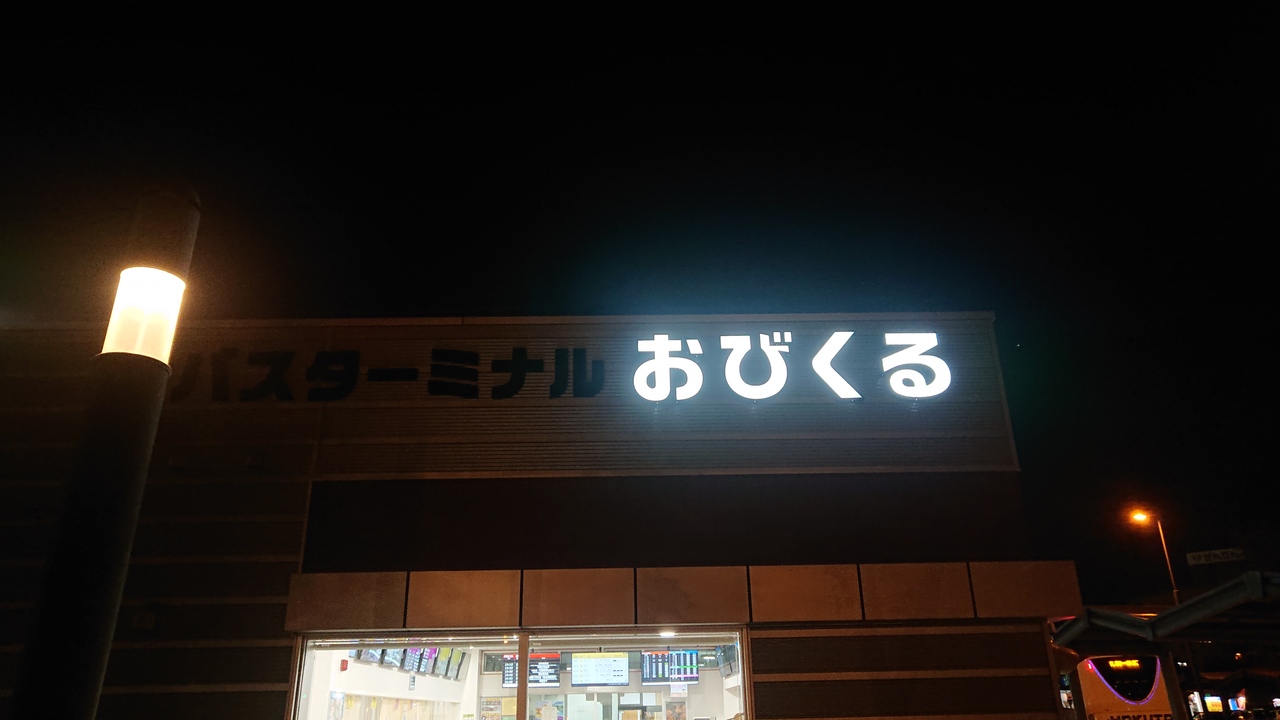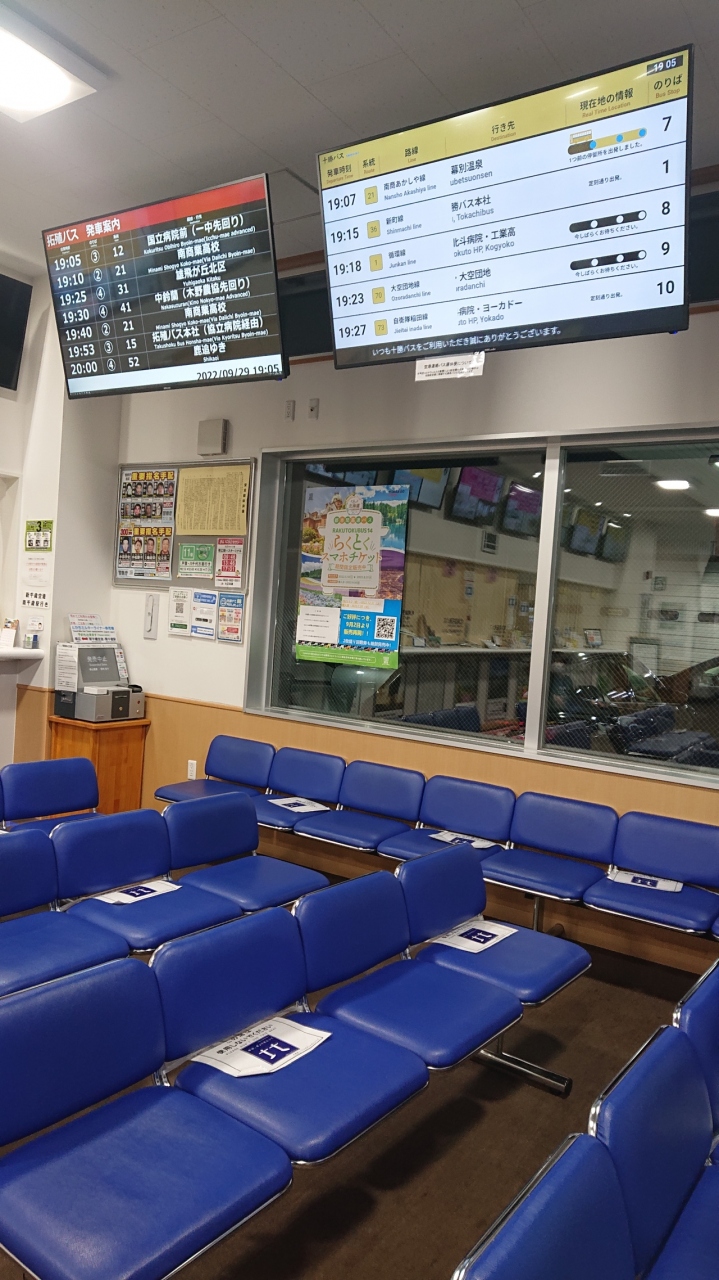 帯広駅の北口に広がっている、バスターミナルです。待合室兼有人券売所も設置されています。9月下旬の平日の午後7時頃に訪問しました。待合室前には、ちょうど、札幌行き高速バスの最終便が停車していました。また、待合室内には、発車時刻案内のビジョンも設置されており、利便性が確保されているな、と感じました。