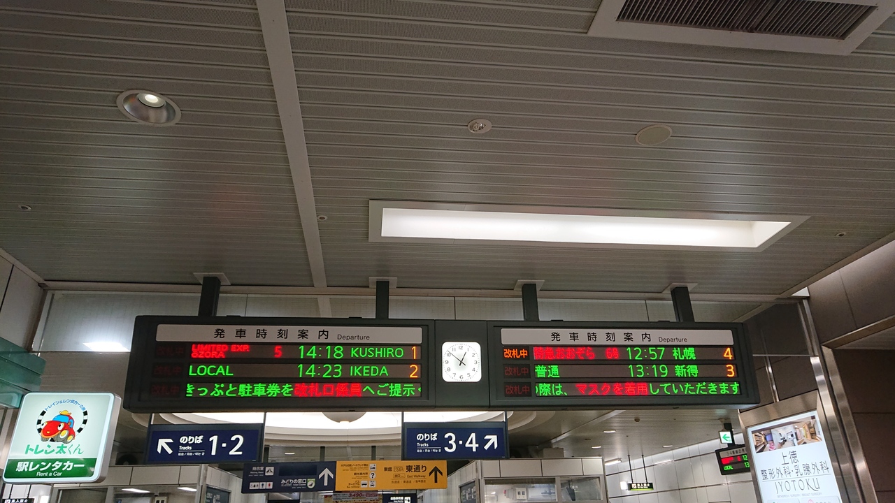 10月上旬の平日の朝に、札幌駅7時58分発の特急とかち1号に乗車しました。なお、利用区間は、札幌駅から芽室駅まででした。Jアラートが北海道に発令された関係で、列車には多少遅れが生じました。もっとも、安全第一ですから、これはやむを得ないこと。指定席車の可動式枕付きの座席で、全般的には快適な移動となりました。