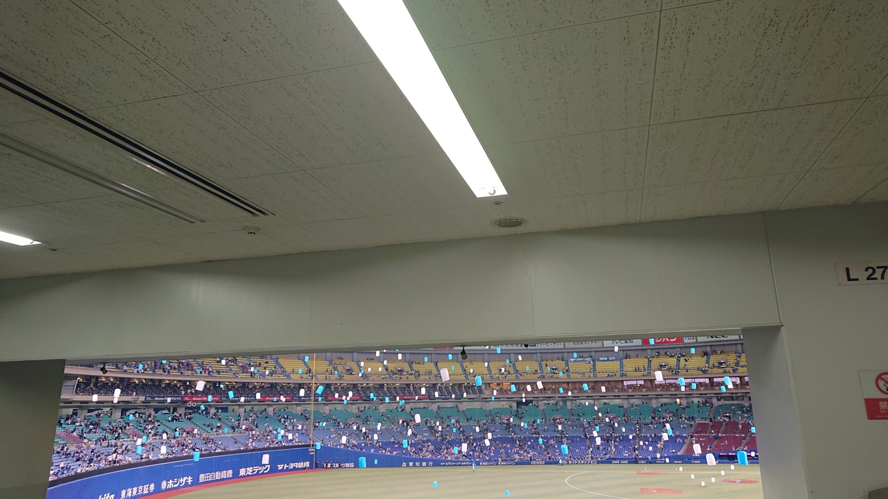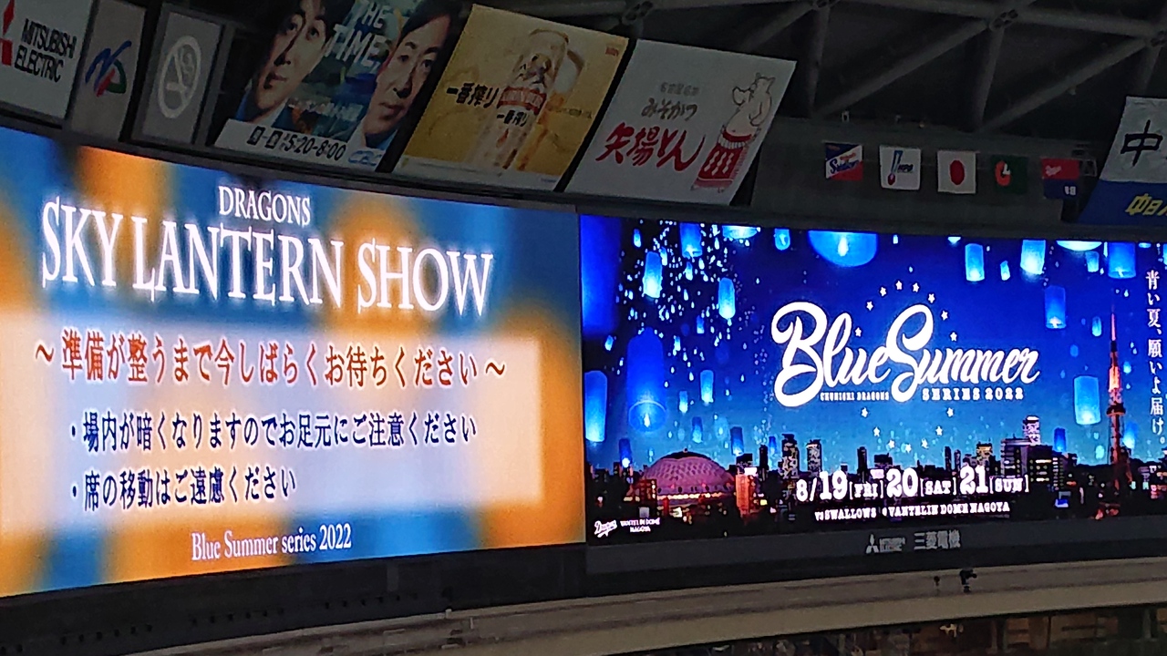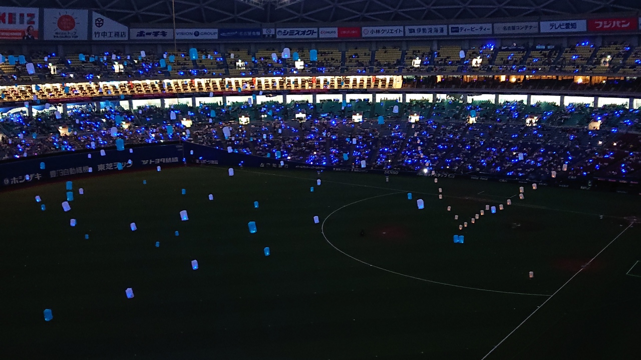8月下旬の休日に、プロ野球公式戦、中日対ヤクルトを観戦しました。席種は、3塁側パノラマA席。座席位置は、77通路58列400番台でした。試合は、接戦を、8回に中日が突き放す形で、5対2で中日の勝利で、面白かったです。しかし、それ以上に印象に残ったのは、試合後に、ブルーサマーシリーズの特別企画として開催された、「スカイランタンショー」。照明の落とされたドーム内に、ランタンが地上から、浮き上がり、浮かんでいる様子は、幻想的で、素敵でした。