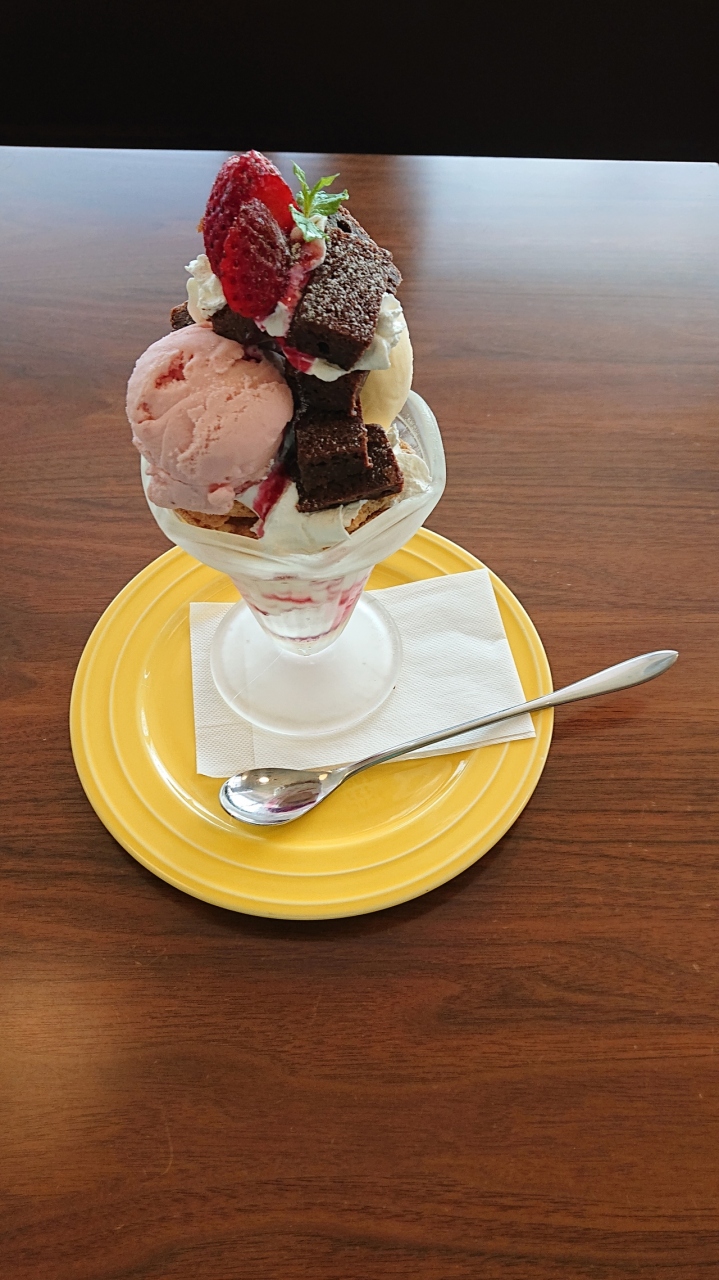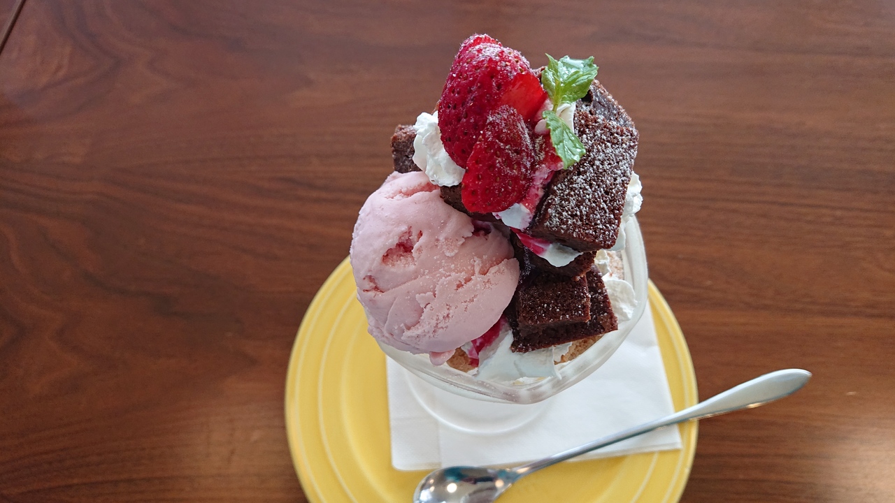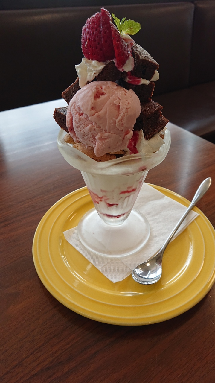 8月下旬の平日夕方の時間帯に訪問しました。店内は一定程度の客入りで、落ち着いた雰囲気でした。注文した、「ストロベリーブラウニーパフェ」は、ストロベリーとバニラのアイスプラス、チョコブラウニーに、ババロア、といった感じの組み合わせの、欲張りなパフェ。おいしくいただきつつ、一休みできました。
