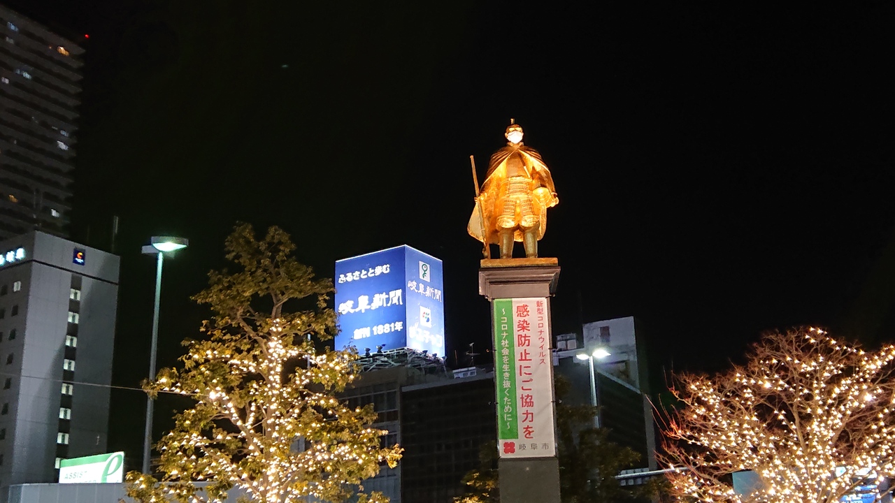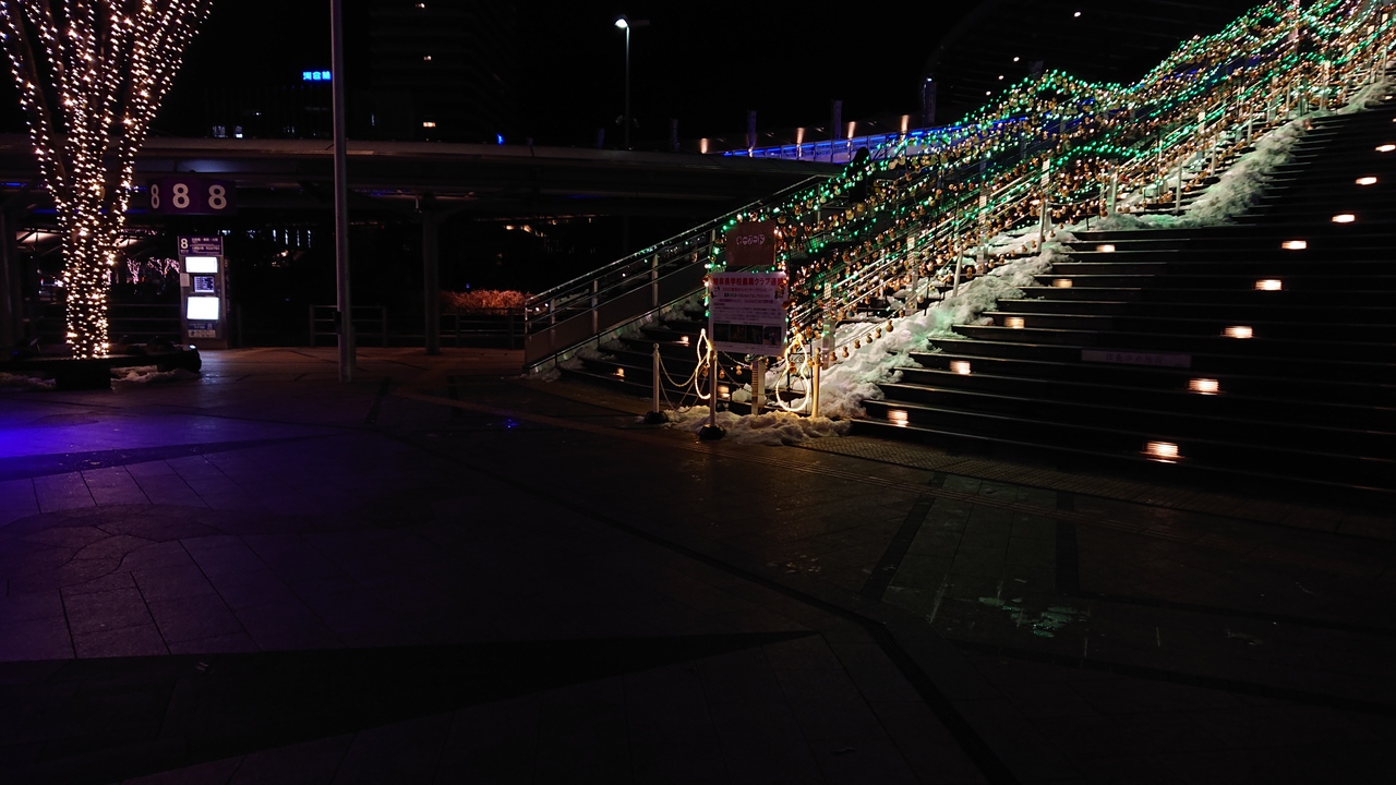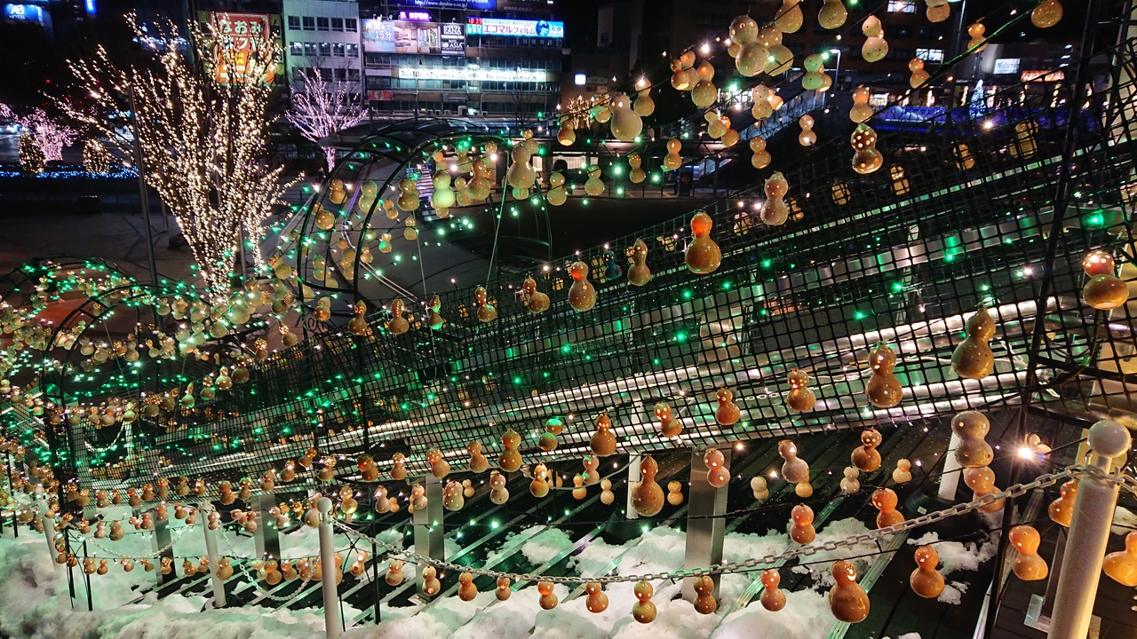 1月中旬の週末夜の時間帯に訪問しました。岐阜駅前のデッキや広場がライトアップされており、綺麗でした。今回の訪問で特に印象に残ったのは、「ひょうたん」を用いたイルミネーション。岐阜らしさが出ている装飾で、良いな、と感じました。