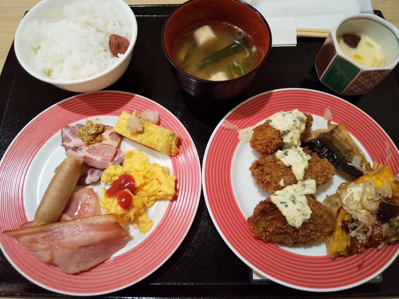 朝食は、口コミ通りとても美味しく、お好み焼やカキフライ等、ビュッフェだからある程度は・・・と妥協しなくても良いほど普通に満足できるレベルです。スイーツ系も豊富です。