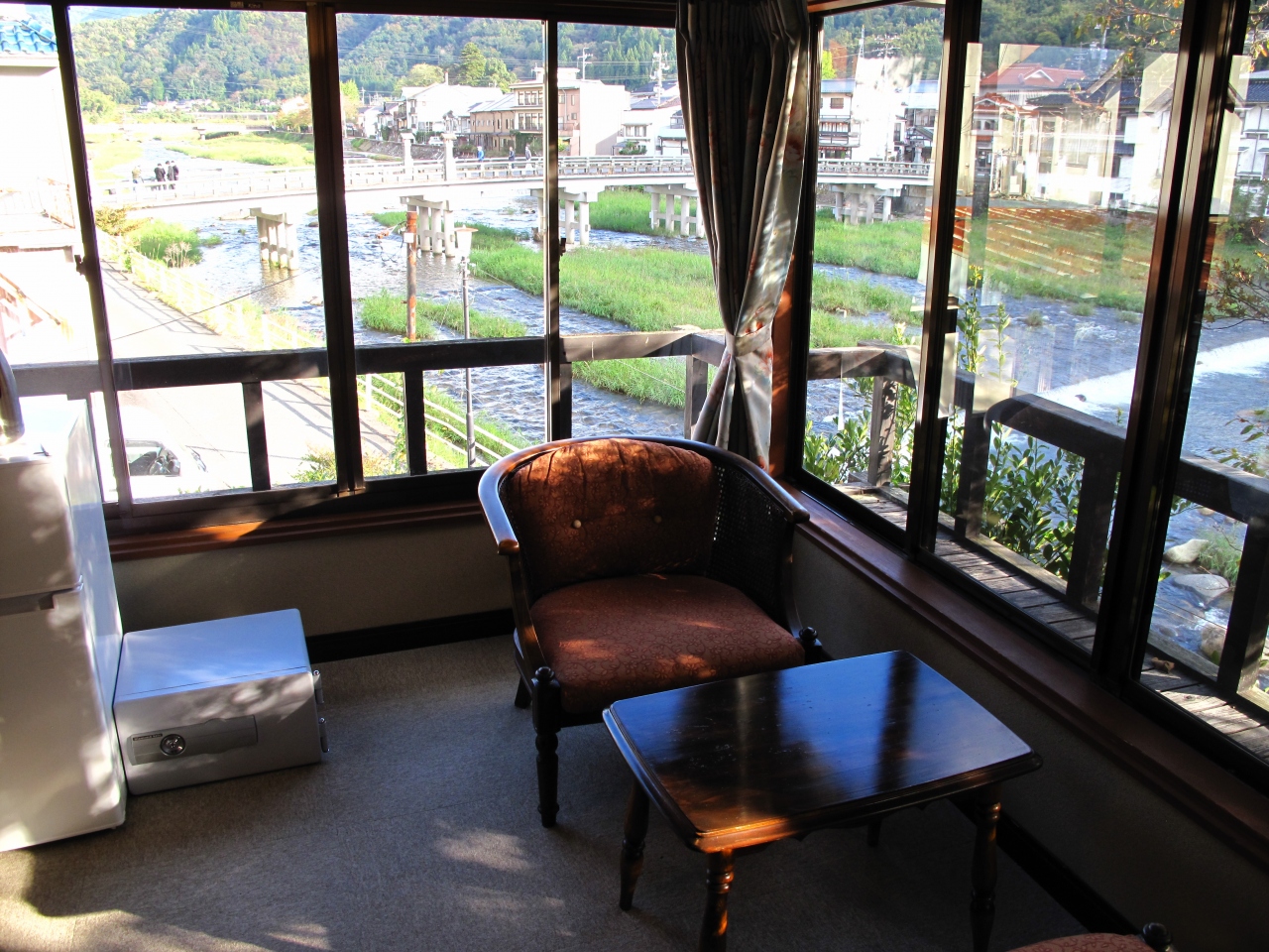 アサインされたお部屋は角部屋で三徳川が良く見える古民家風の内装。鏡台などリアル戦後の佇まい。好みが解れるトコロです。また、洗面台は冷水の蛇口しかないです。真冬の洗顔は温泉浴場でしましょう。