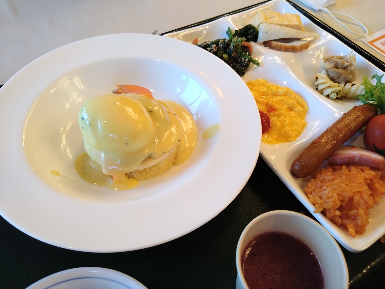 朝食も、エッグベネディクトやハンバーガーどちらか一つ選べます。ハンバーガーですが、下のバンズが冷たく少し残念。たまたま外れだったのか、ゲストとしては、そのひとつがハンバーガーの印象になってしまいます。夕食と同様品数豊富でスイーツ&デザートも潤沢、御飯とシジミの味噌汁も美味しいです。