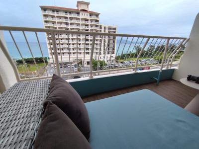 ラナイのカウチソファーで向いのホテルのコンビニで仕入れたパンとコーヒーで朝食をとりました。車の騒音が向いのベストウエスタンホテルで跳ね返ってくるのか、やや騒々しいですが海も見えるので気持ちイイです。