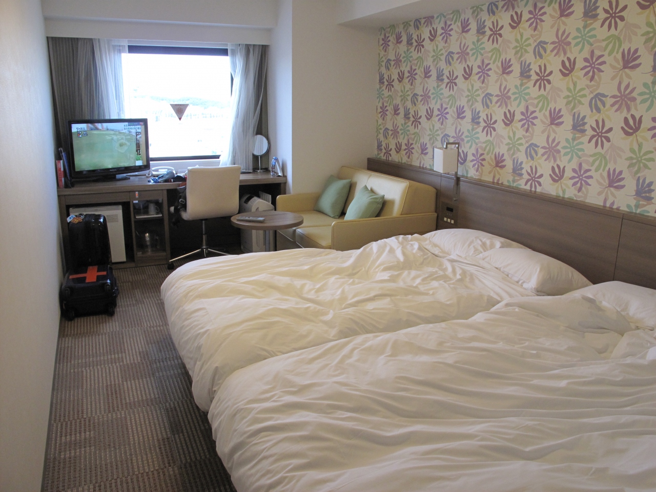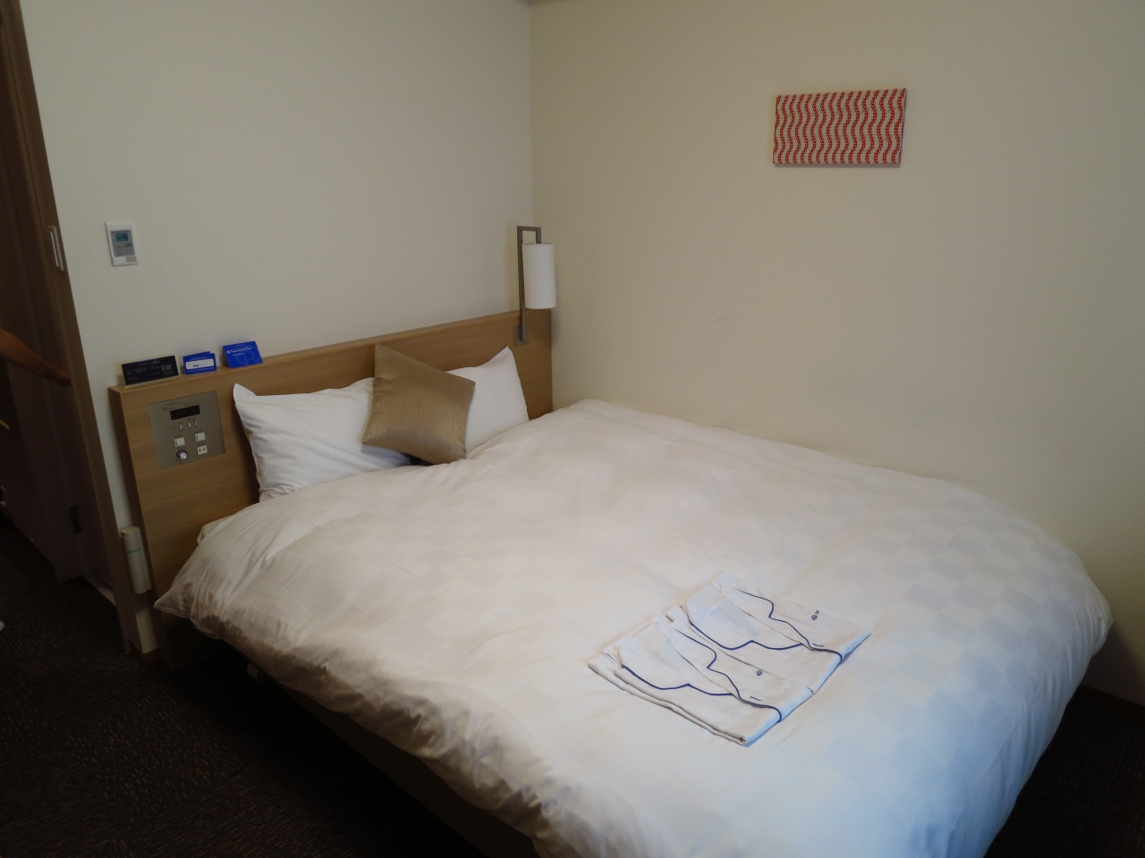 部屋は、ハッキリいって狭いです。スーツケースを広げるとすればベッドの上しかありませんが、成田からスーツケースを宅配で送ったので特にマイナスには感じませんでした。ベッドは140cm幅のダブルで、マットの硬さも適度で良かったです。