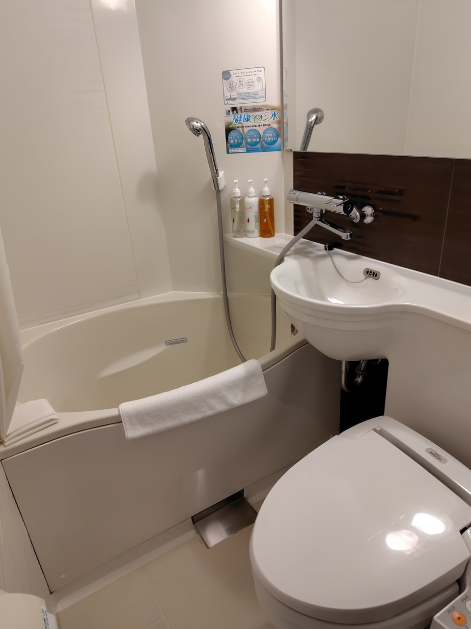 戸塚駅東口からすぐのところにあります。線路沿いにありますが、部屋の位置にもよるかもしれませんが自分が泊まった部屋はあまり電車の音は聞こえませんでした。大浴場もありますが、男女入れ替え制で、曜日によって違うようです。(ホームページをご覧ください)ウェルカムドリンクはアルコールもあり、18時~20時まで利用できます。