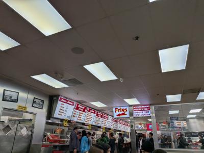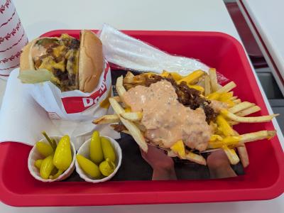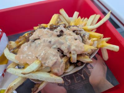 フレンチフライも「アニマルスタイル」に。こちらのほうが頼んでいるお客ンが多い。グリルタマネギにサウザンアイランドのようなソース、そしてチーズがたっぷりフレンチフライにのっており、味のインパクトが強い。