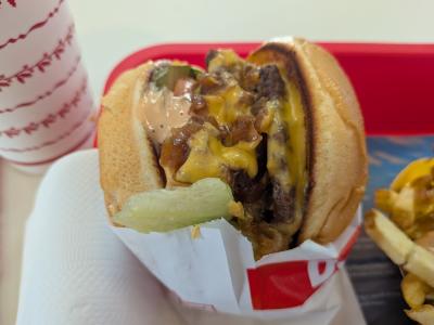 今回は「アニマルスタイル」という通常メニューにはない「裏メニュー」をオーダー。裏メニューとは言っても、結構頼む人も多く、レシートにもしっかりと記載。普通のバーガーとの違いは、グリルしたタマネギ、ピクルス、サウザンアイランドのようなソースが追加で入っています。ソースの濃厚さとグリル玉ねぎの甘さをしっかり楽しめます。