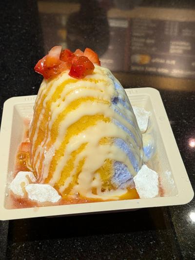 アイスのシロップは保存料や甘味料を使用しないナチュラルにこだわったもので、本物のリリコイ(パッションフルーツ)、ライチ、マンゴーなどを使用。トッピングの求肥も自家製とのこと。一番人気のハワイアンレインボーをオーダー、ストロベリー、マンゴー、ココナッツ(青い部分)のシロップの上に練乳がかかっていて、口当たりはなめらか。