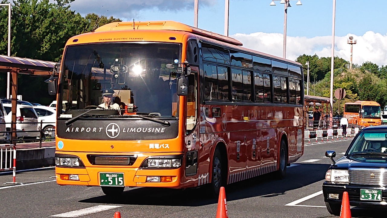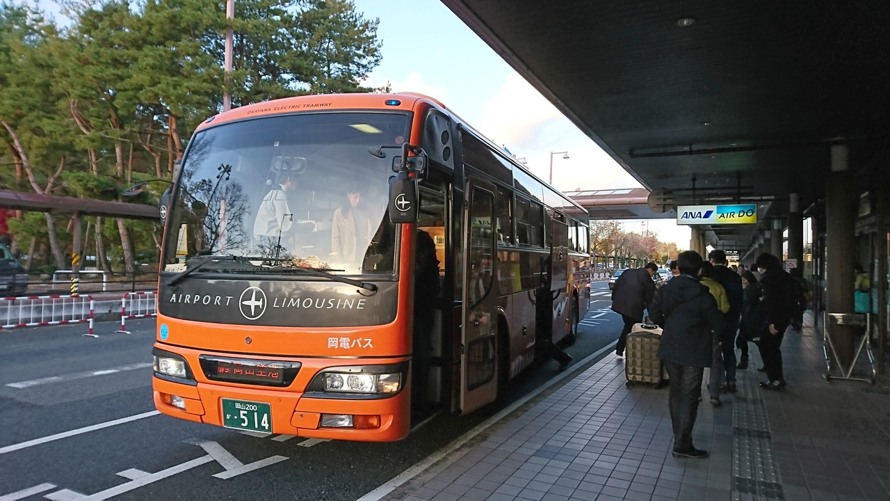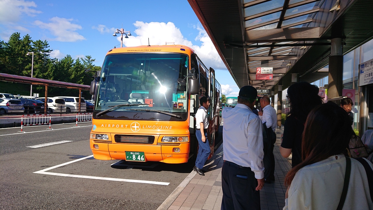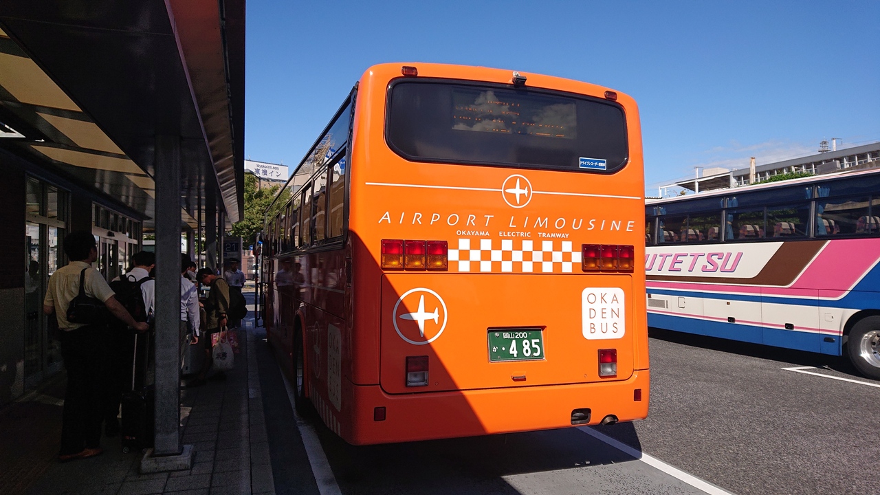 岡山空港から岡山駅西口まで、ノンストップ便、特急便ともに約30分、倉敷駅北口まで35分で結ぶ連絡バス。岡山駅行きは岡電バス(岡山電気軌道)と中鉄バス、倉敷駅行きは下電バス(下津井電鉄)の共同運行。運行事業者は概ね一本ごとで、飛行機のダイヤにあわせて運行されるので、毎月、時刻が変更になります。どちらもきれいなバスで、特に水戸岡鋭治さんデザインのオレンジ色の岡電バスはよく目立ちます。岡山駅からの場合ノンストップ便と、岡山大学筋なと3つの停留所に停まる特急便がありますが、どちらも30分。JAL、ANAの両方の東京便が重なる時間帯のバスは満席で次のバスを指示されることもあるので注意。岡山駅と岡山空港の券売機ではEdyやWAONが利用可能。岡電バス、下津井バス運行便は岡山地域の交通系ICカードハレカに加えてSuicaやPASMO、PiTaPaなど全国の交通系ICカードが利用できますが、中鉄バス運行便は利用できません。(2019年9月修正)