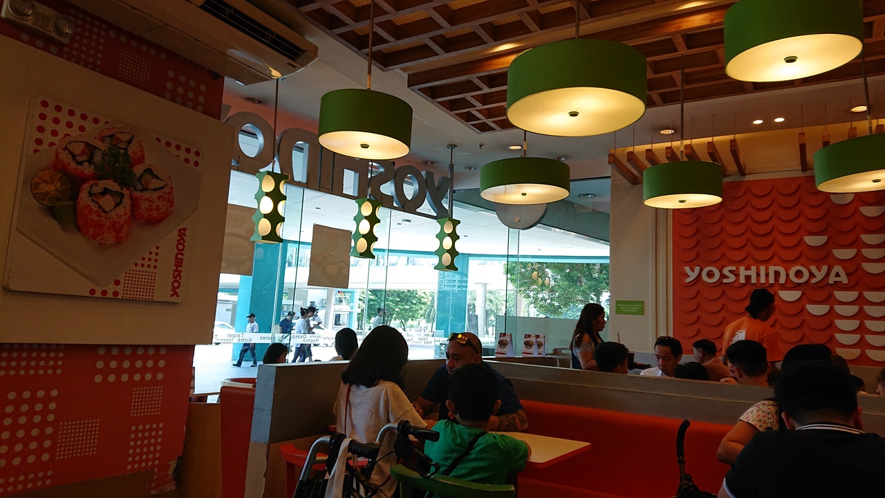 SM Mall of Asiaにある吉野家(YOSHINOYA)。オレンジ色と牛のマークですぐわかります。メインは牛丼で158ペソ(=350円くらい)ですが、ラーメン、寿司、天ぷら、をはじめ、メニューが豊富。日本にはないコンボメニューもあり嬉しい。注文すると係りの方が運んでくれます。牛丼の味は日本と変わらない気がしましたが、Beef Yakinikuの味付けはフイリビン人好み の甘い味付け。ご飯は日本のような粘りけのあるものではないです。牛丼の場合は丼ぶりで提供されますが、コンボは低めのプレートで提供されるので、自ずと汁だくになってしまいます。また、スプーンで食べるのもフイリビン流。デートで利用しているお客さんもいたりと、日本ではない使い方をしている方も。ご飯好きのフイリビンでも根付いている印象。