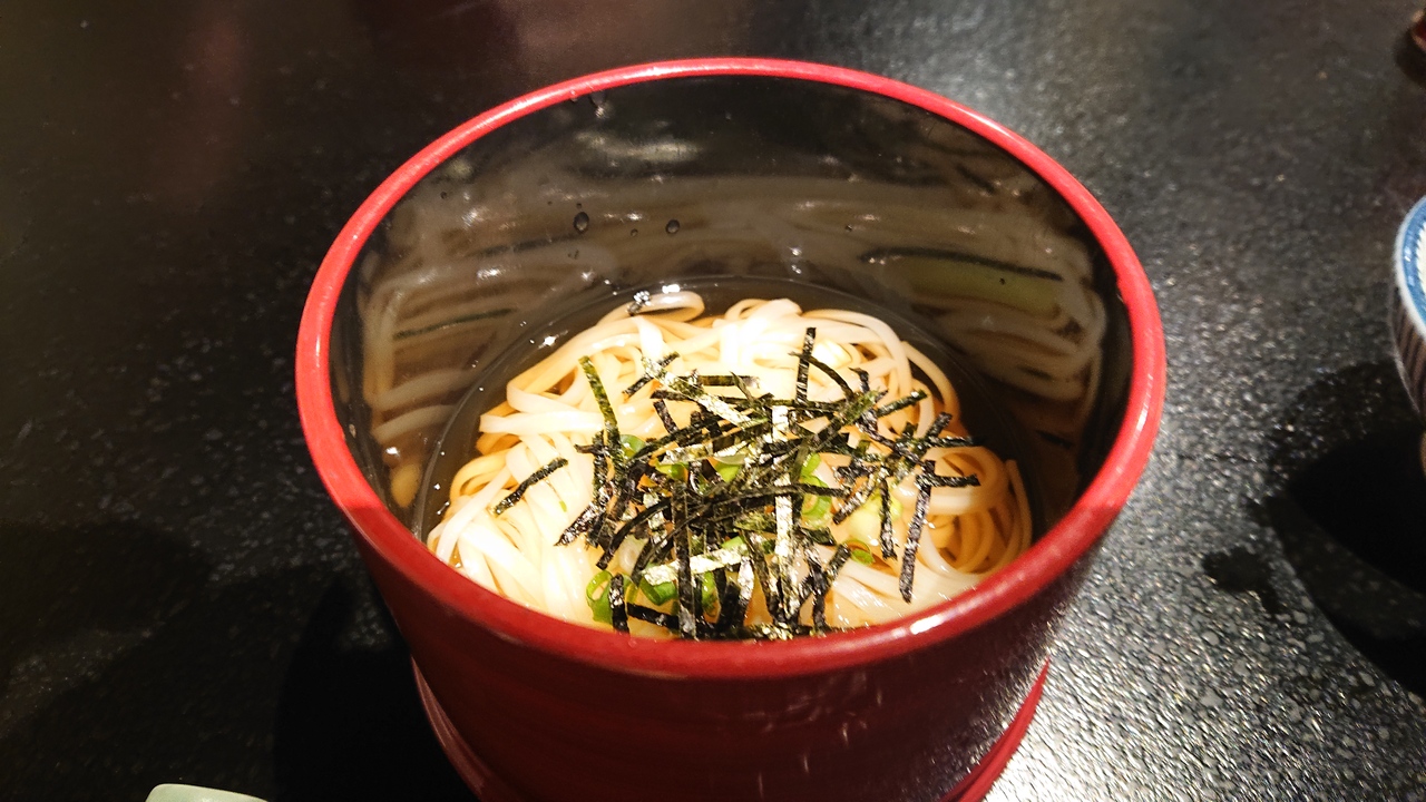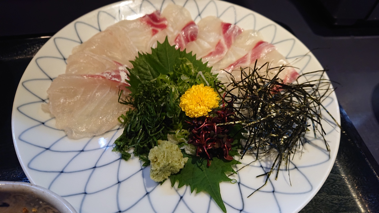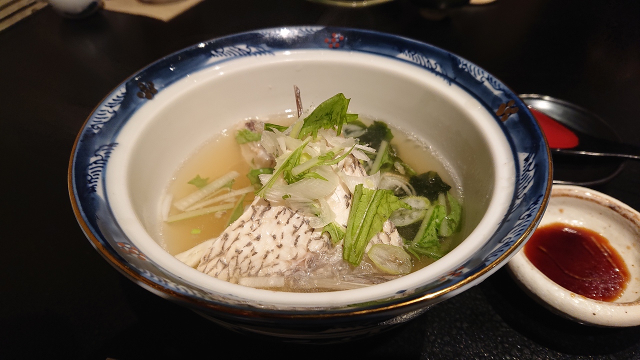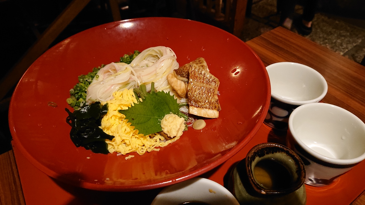 松山市駅、大街道から徒歩圏内。松山中央郵便局の隣にある郷土料理のお店。お店に入ると天井から本物の五色そうめんで出来た縄暖簾が印象的。これだけ見ても美味しそう。愛媛の県魚でもある真鯛を、まずはお刺身で。脂の乗り方がよく、東京では食べられない味。オススメを聞いたところ、タコの唐揚げ、牛のしゃぶしゃぶとのこと。それぞれしっかりと素材がわかる味。こちらのお店は、中予地方で食べられている鯛を炊き込んだ「北条鯛めし」と、南予地方で食べられている鯛のお刺身をご飯にのせた「宇和島鯛めし」の両方が食べられるのですが、あいにく両方とも売り切れ。そこで看板メニューの「鯛そうめん」をオーダー。鯛をまるごと盛られたものもありますが、食べにくいので鯛の切り身のものに。素麺は、細い麺ながらしっかりとしたコシが感じられます。麺つゆは鯛の煮汁がベースなもので、こ 素麺の味を引き立てます。薬味を入れることで渾然一体の絶妙な味に。松山に来たら、鯛そうめんは外せない。お酒も愛媛の地酒や焼酎、地ビールが中心。料理との相性も抜群でした。思っていたよりもリーズナブルで満足度の高いお店です。