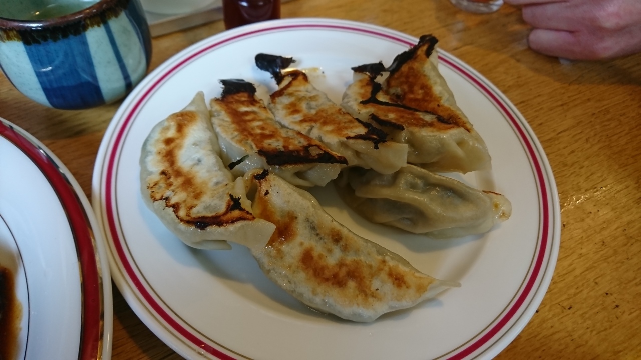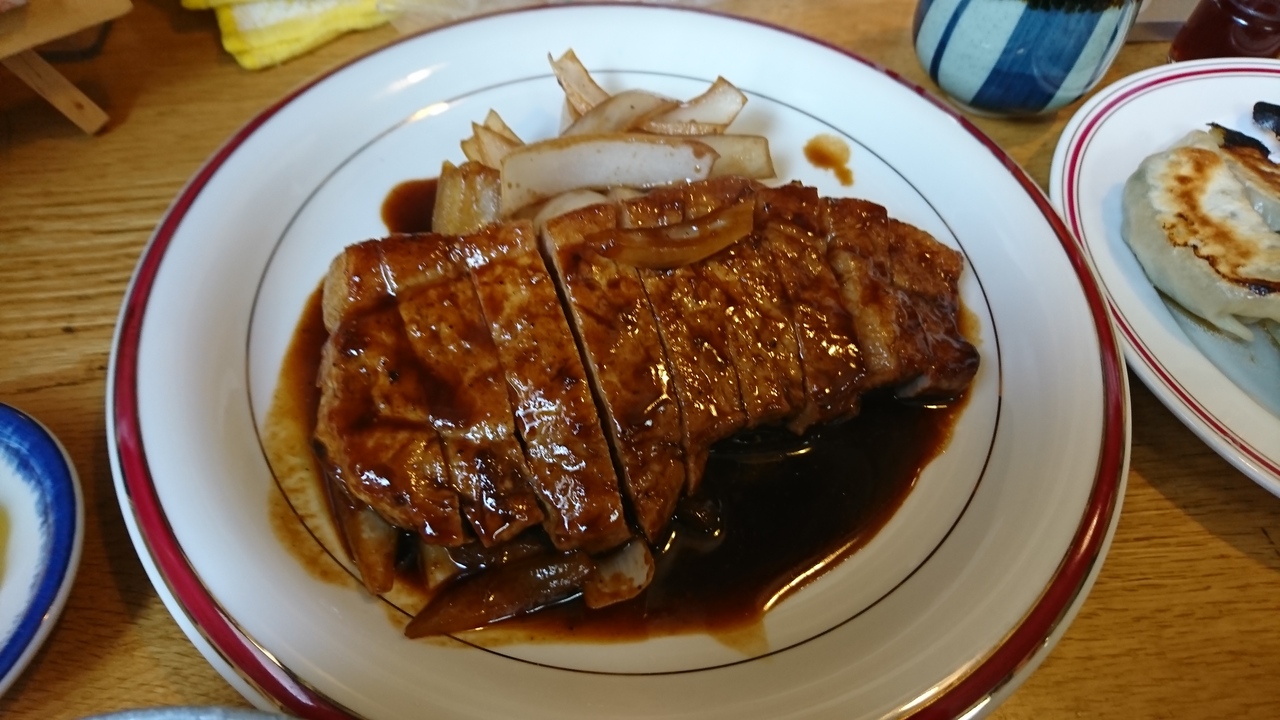 旭川駅から平和通買物公園を徒歩10分くらいのところの路地を入ったところにあります。見た感じは、古く、路地に入ったお店には、少し近寄りがたい印象すらある。しかし、こういったお店が旨い。11時半開店なのに、結局開いたのは11時40分少し前。何名かのお客さんが待っていました。テレ東のドラマ「孤独のグルメ」スペシャル版で紹介された後は、観光客も多数来るようになったようで、カニクリームコロッケとホッケフライ、お味噌汁の「五郎セット」が定番になりつつかありますか、本当は焼肉ととんかつのお店(旭川は昔から養豚が盛んなので、お肉が美味しい)。カツカレー、わらじ焼肉、塩焼き、五郎セットに迷いに迷って「肉ライス」(ポークチャップ)と、たまに出る餃子を注文。ポークチャップは、厚めのお肉が柔らかい。脂ののり方がちょうどよい。肉だけでも勝負できる。このお肉にソースベースのタレが何とも言えないいい味。付け合わせの玉ねぎ炒めとともに、ご飯が進みます。餃子は専門店にも劣らないレベル。大判餃子で、肉汁がじわーっと、たまらない。自宅に近くにあったら、絶対リピーターになるお店。多分、旭川の定番のお店になると思う。