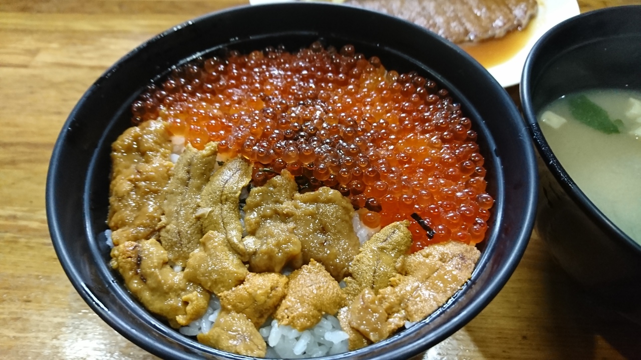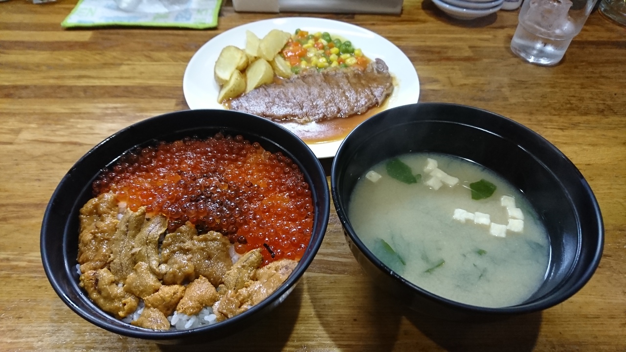 網走バスターミナルから徒歩3分、apt4という網走市内中心部にある商店街の中にあるお店。サーロインステーキのトリプルとかサーロインステーキとエビフライ、ハンバーグ等々、基本的には洋食系のお店ですが、なぜかイクラ丼、イクラうに丼(コンビ丼)、イクラうにホタテ丼(ミックス丼)とステーキのセットがあり、両方をいっぺんに食べることができる夢のようなレストランです。しかも、どちらも手を抜いていない。セットにするとステーキのお肉はやや小降り(丼ものと一緒なわけだから丁度よいサイズ)ですが、お肉は柔らかく美味。イクラうに丼は、ご飯大盛りで、イクラもうにもたっぷり。お味噌汁も丼で提供(これも美味)。お店の方は、とても元気で、声をかけてくださります。店内は厨房がよく見えて、本格的な料理作りがわかります。しかも、これがかなりリーズナブル。「経営成り立つの?」という感じです。「網走に行くならこのお店」だと思います。
