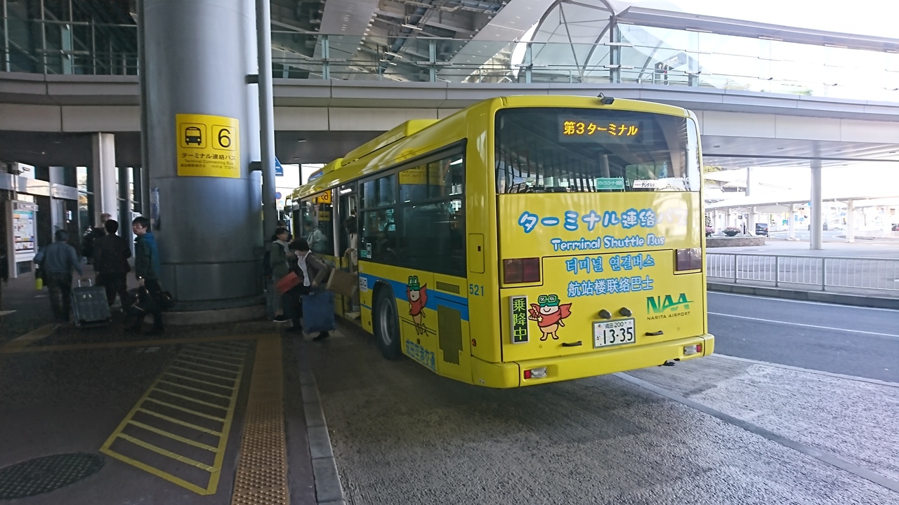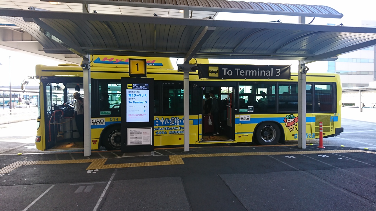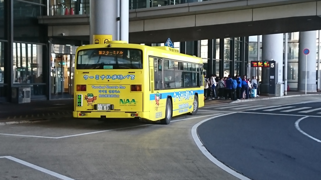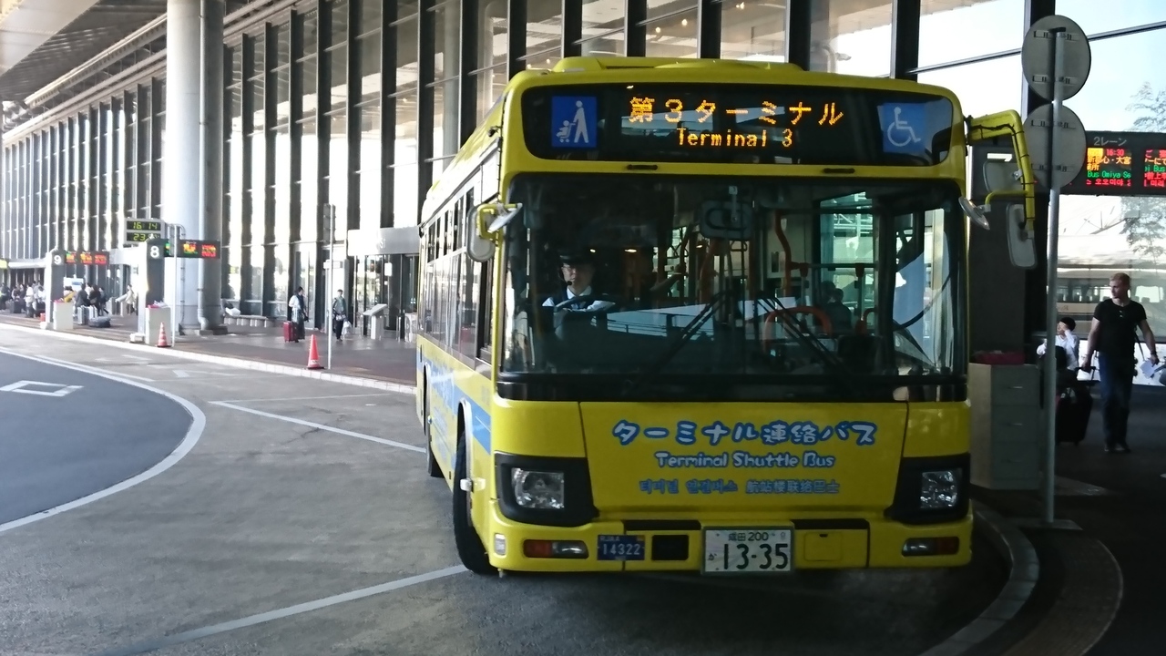 成田空港内を循環する黄色い車体の無料連絡バス。日中は7分おきに運行されており、無料。成田空港交通という会社が運行している。路線は、