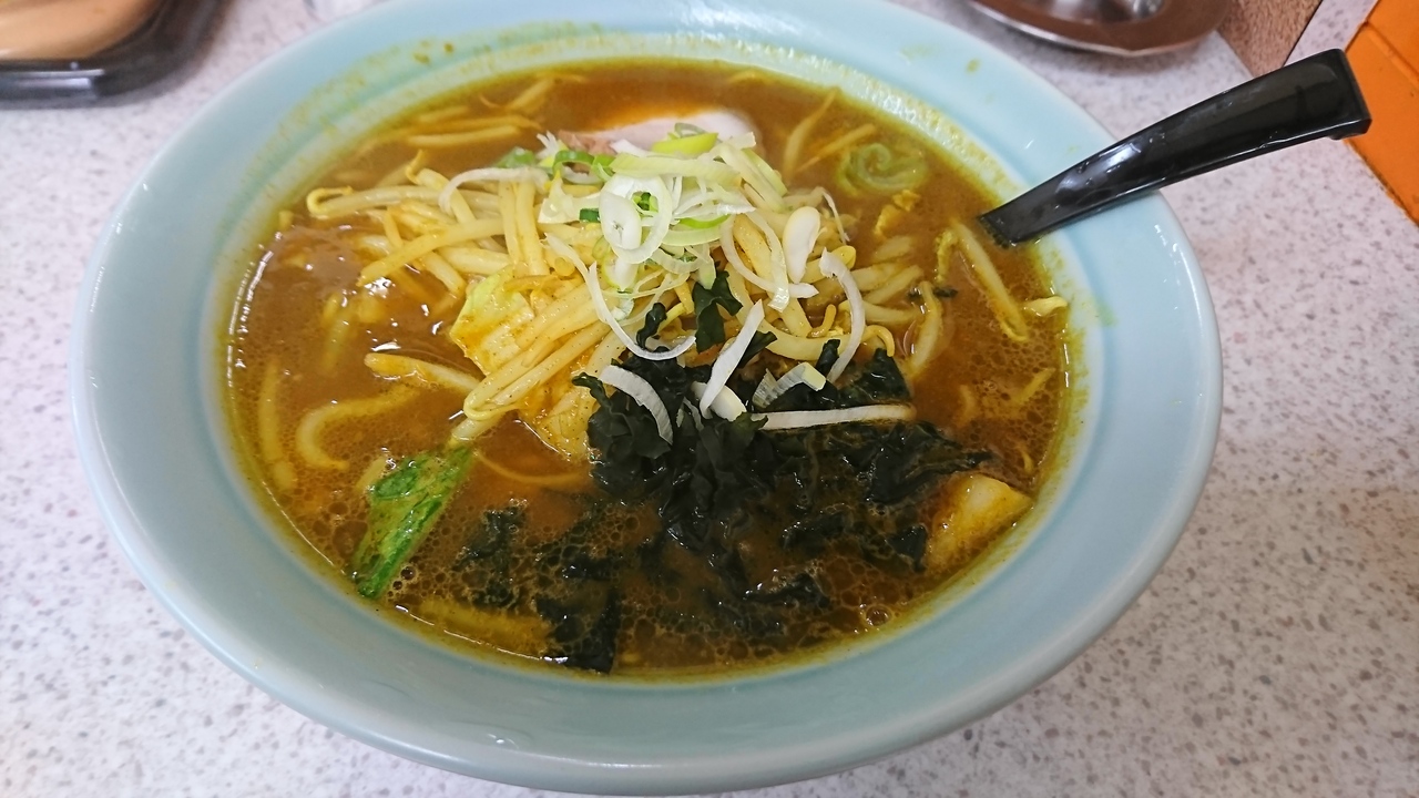 東室蘭駅西口を出たすぐのところにあります。見た目は、昔からありそうな古いラーメン屋さん。休日の12時過ぎ、お店の前からカレーのいい香り。店内はカウンター席を除きほぼ埋まっていました。中国語での注記(お一人様一品以上)があるので、外国人も含め観光客も多いようです。注文が入ると、鍋にベースとなる白菜やネギ、モヤシの入ったスープが作られ、秘伝と思われるカレーペーストをどんどん入れていく。スープが完成した頃、麺が茹で上がり完成。チャーシューは後からのせられるので、スープは野菜ベース。野菜の甘味のあるスープは、カレーの味を嫌味なく引き出しており、白菜やもやしはシャキシャキ。辛さは後から来るタイプだが、嫌な辛さではない。食べ終わったあと、また、食べたいなと思わせるカレーラーメンはなかなかイケる味で新発見でした。