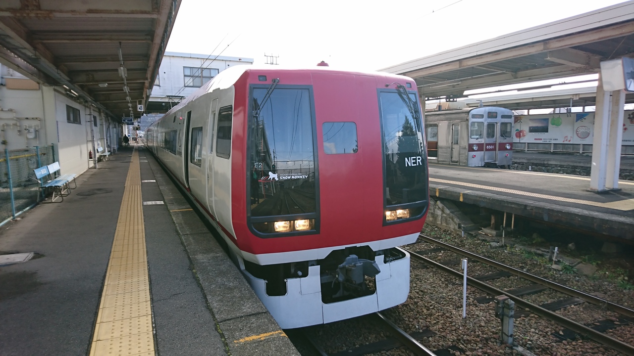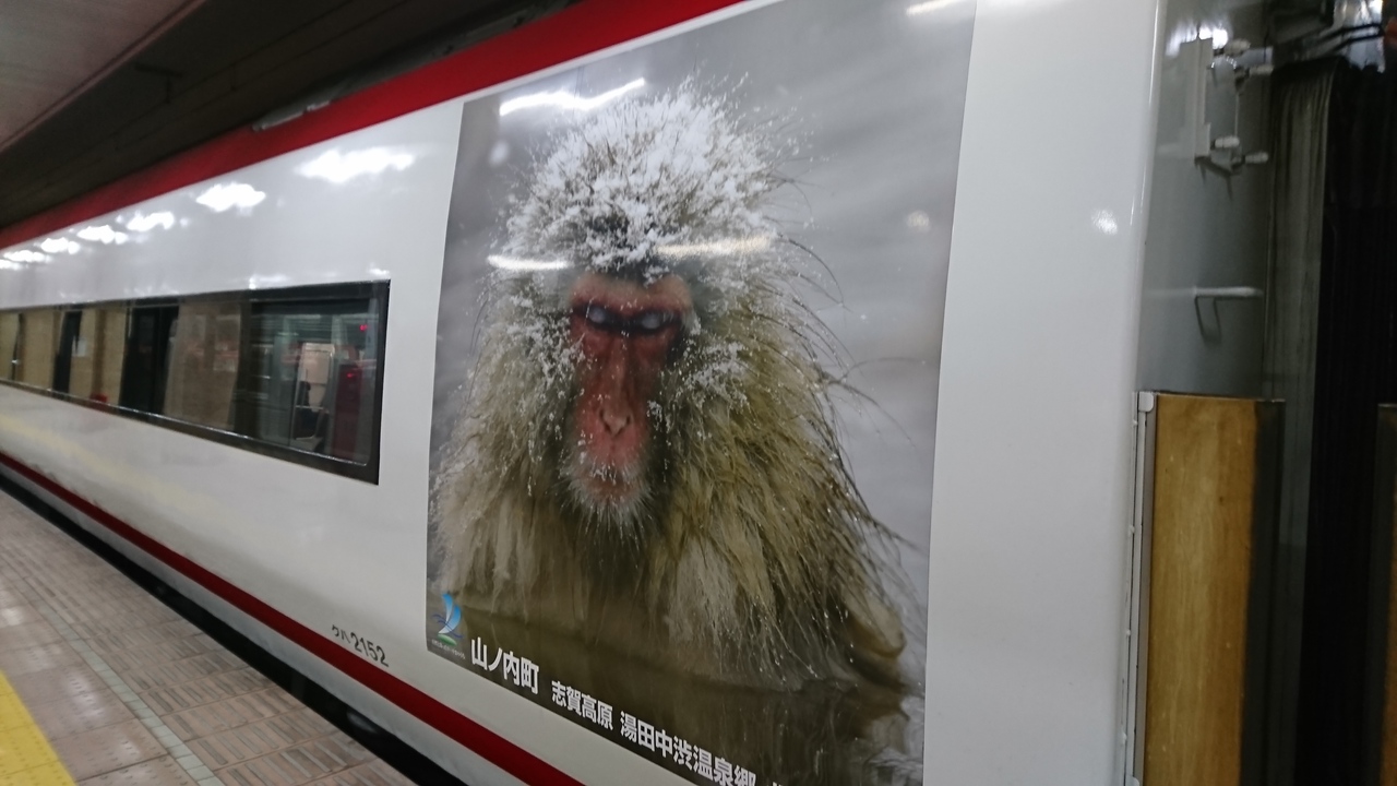 長野電鉄自慢の特急のひとつ。停車駅の少ないA特急なら長野から信州中野へ32分(普通電車47分)、湯田中へ45分(同67分)で結びます。もと小田急のロマンスカーの「ゆけむり」に注目が集まりがちですが、こちらはもとは成田エクスプレスで使用されていた車両で、1号車には1000円で利用可能な個室指定席(SPA猿~ん)まであり、豪華な印象。特に1号車(湯田中方向)はもともとグリーン車であった車両なので、座席は回転、リクライニングの角度も深く、ゆったりしており、オススメ(他の車両は集団見合い式で、座席は回転しない)。猿が露天風呂に入った写真をまとう車両は、空港アクセスから長野の街に溶け込んでいます。どこまで乗っても特急料金は100円なので、気軽に乗れます。