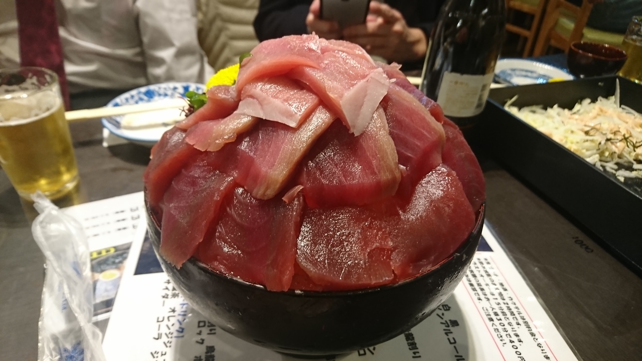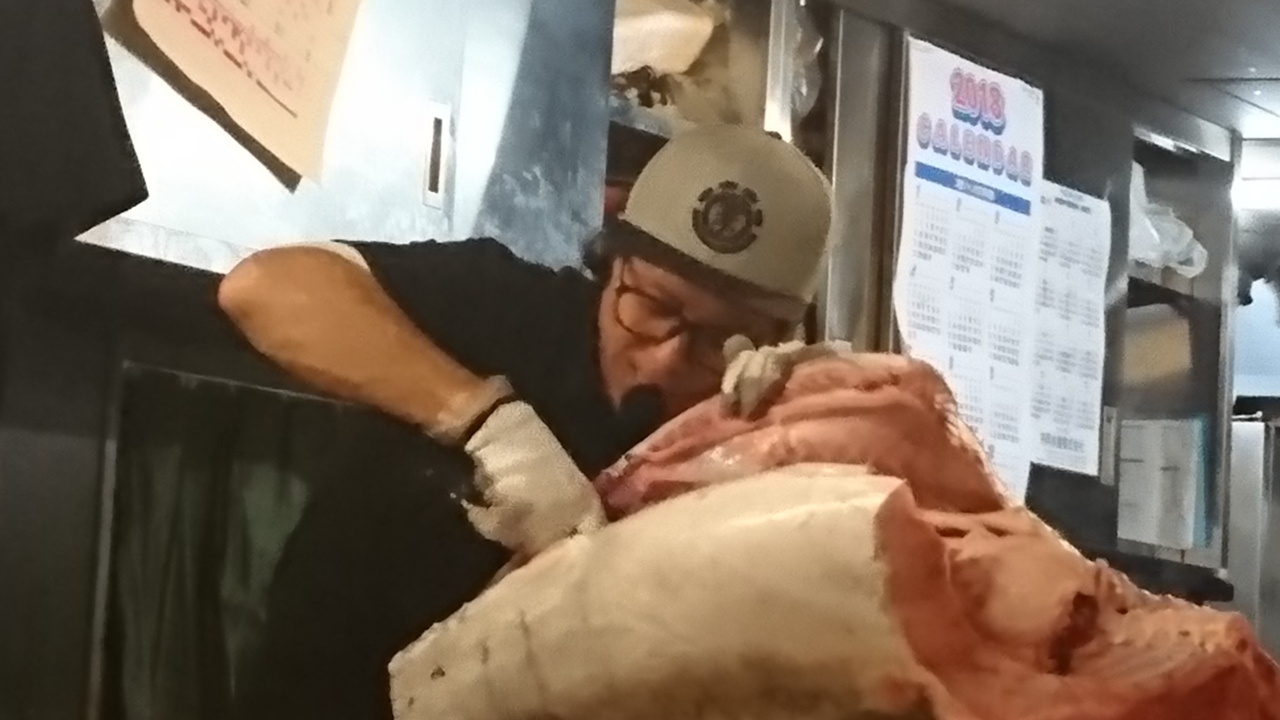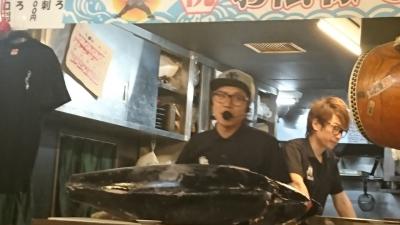 総武線馬喰町駅、浅草橋駅から徒歩すぐ。秋葉原からも徒歩圏内のところにあります。テレビドラマ「半沢直樹」のロケでも使われたお店で、このほか大将はテレビ出演が多数。お店の売りはコースの安さ(3000円くらいからある)とマグロ解体ショー。マグロ解体ショーは、マイクをつけたお兄さんが解説をしながら切っていく、エンターテインメントのようなもの。切りながら部位ごとにオークションをして、一番高かった方が落札します。普段、なかなか食べられない部位が安く食べることができたりして楽しい。また、じゃんけん大会などもあって、商品をゲットも可能。参加賞なのか、特製のガッツラーメンをもらいました。