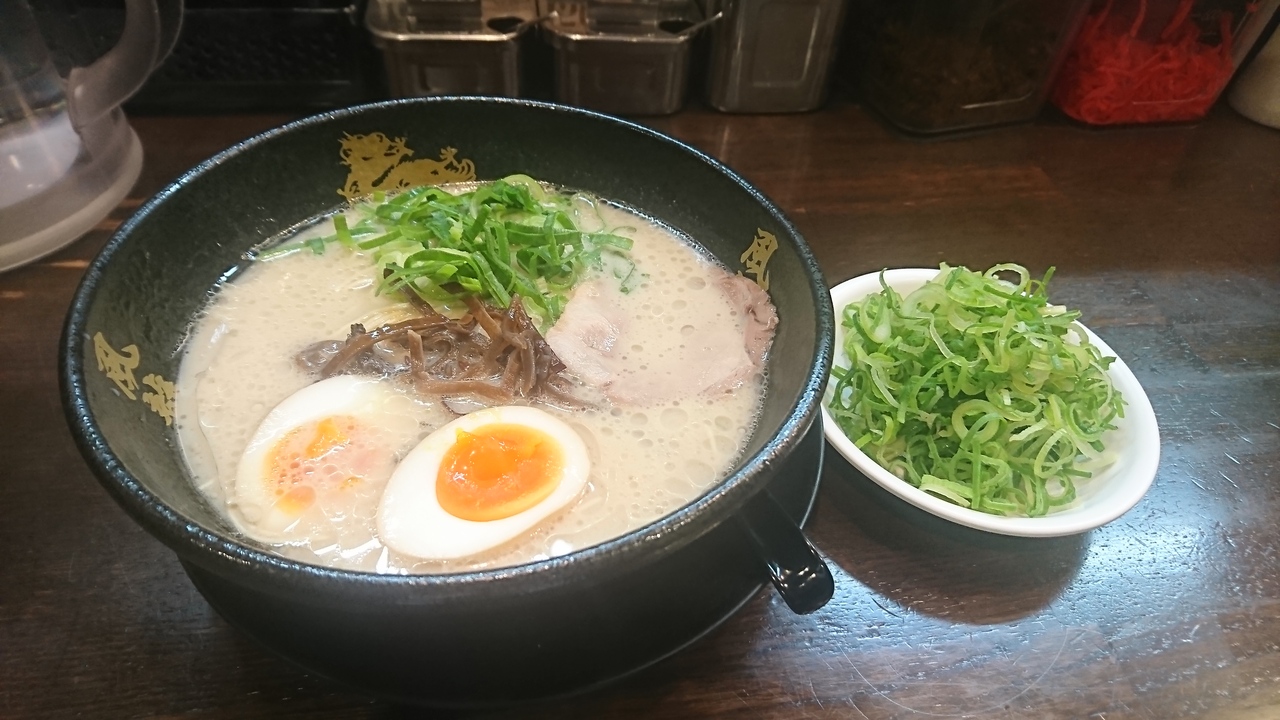 丸井上野店の横の道に入ったところにあるお店。上野駅から徒歩すぐのところにあります。カウンター11席、4人掛けテーブル席1つ、お店は細長く狭い。上野周辺はラーメン屋さんがたくさんありそうでそうでもない地域のようで、また日曜を除き深夜2時までやっていることもあり、夜遅くは混雑。金曜の夜は外まで行列ができることも。メニューは他の博多風龍と変わらず、替え玉も2回まで無料は嬉しい。クリーミーなスープ、細い麺、麺の茹で方が四種類なのも同じ。味玉とねぎ入りが50円割引でやってました。