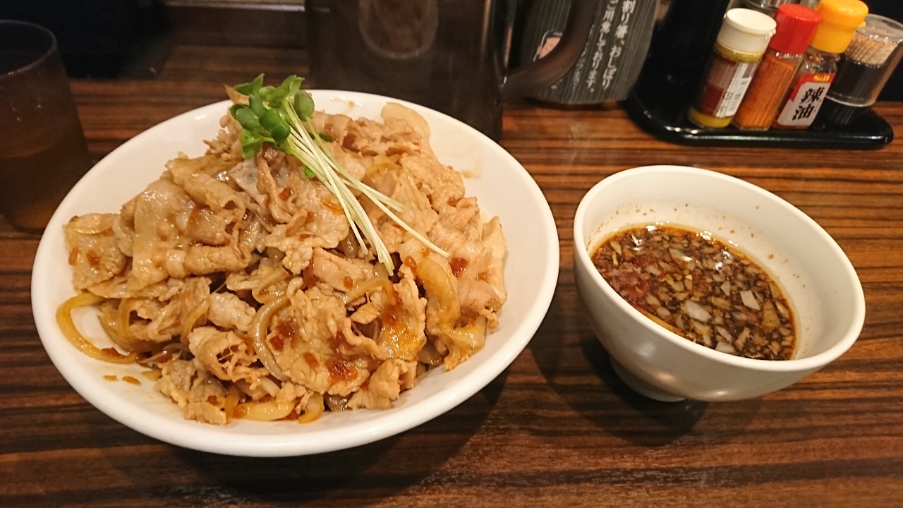 フレンチや和食の世界からラーメンの世界に入ったという竹田敬介が展開するラーメン店の一つ。湯島駅近く、御徒町駅からも歩ける距離の場所にあります。ド定番という「肉もりつけ麺」をオーダー。炒めた豚肉が平麺の上にのっていて、まずは混ぜそばのように食べる。結構、肉に味がついており、その味を絡めるためなのか、麺はかなりの平麺。カップうどんの麺を食べているような印象。続いてつけ汁につけて食べる。つけ汁の味はかなり甘めで濃い味で、全く違うものを食べている感じ。普通のラーメンとはかなり異なるインパクトのあるつけ麺でした。「卓上の玉ねぎを入れるとアクセント」とのことであったが、どこを探しても無かったのは残念。
