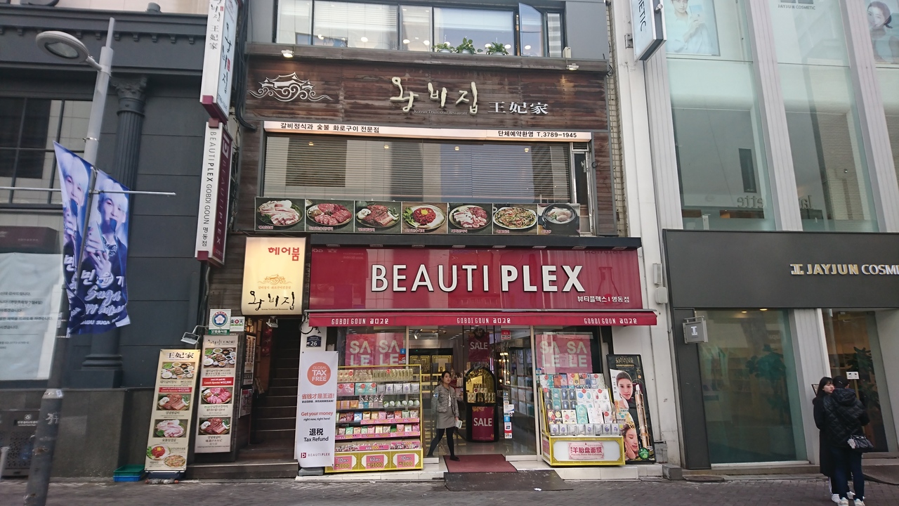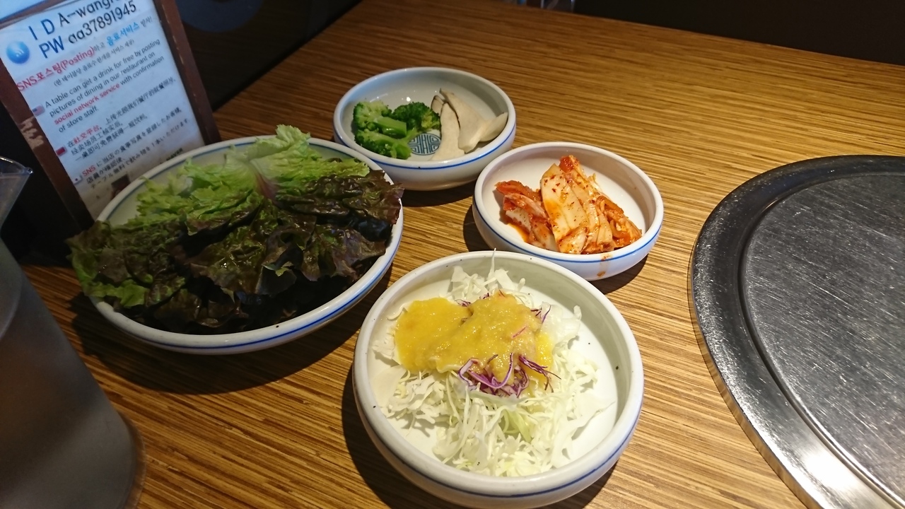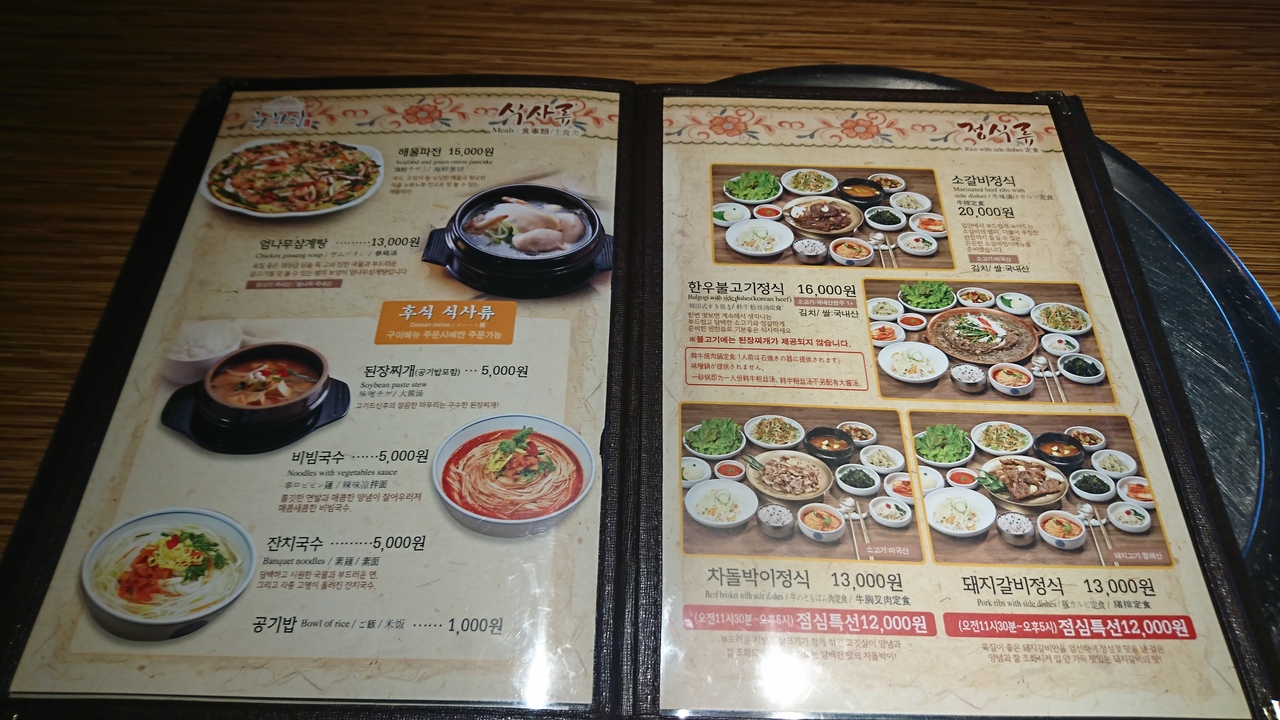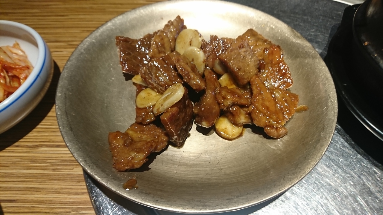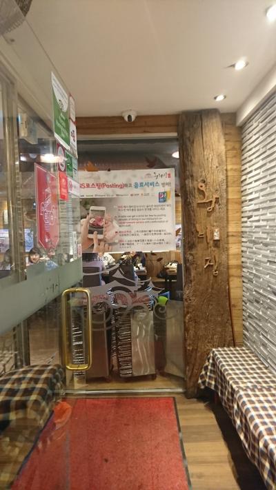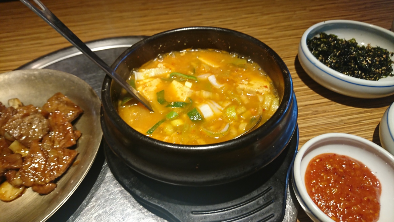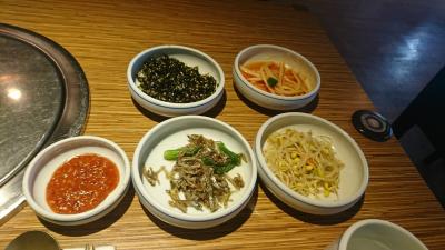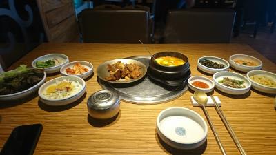 明洞にある焼肉店で、日本人向けの韓国案内サイトにも掲載されている有名店です。ビルの2階にあるお店は、きれいで、焼肉店にしてはお洒落な雰囲気。「一人でもよいか?」と聞くと、もちろん大丈夫とのこと。店員さんは明るく、テキパキ動いている印象。11時30分からランチスタートとのことですが、3分前に行ったところランチの注文もオーケー。5分も過ぎるとお客さんでいっぱいになり正解でした。まず、一人分には多すぎるくらいの多数のおかずと、グツグツ煮込まれたジャガイモ入りの味噌チゲが運ばれます。それぞれが美味。そして真打ちの豚カルビが登場。お肉は柔らかく、甘辛い味がたまりません。エゴマやレタスと一緒に巻いて、おかずを挟んでも美味しく食べられます。韓国の焼肉店は、一人客には冷たいお店が多いので、貴重な存在かも。
