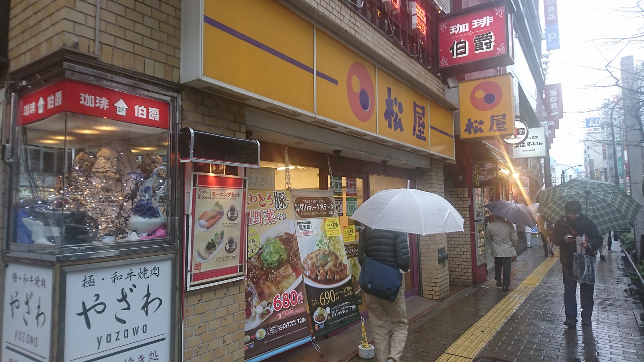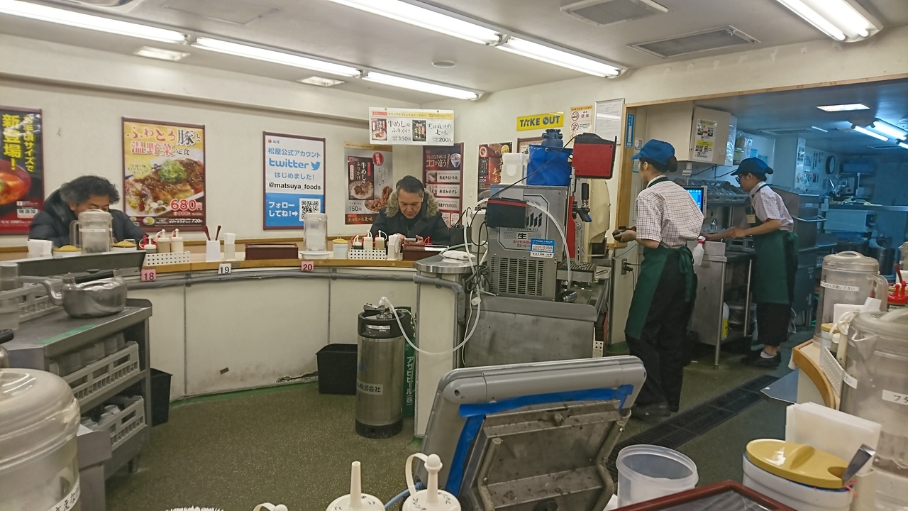 西武百貨店池袋本店横(正確に言うと無印良品の隣の隣くらい)にある松屋。9の反対のような感じてカウンター席のみで20席。メニューは定番メニューで、他店舗と変わりはありませんが、キムカル丼の特盛をやっていました。お客さんは老若男女という感じで、さすがに子供はいませんでしたが、女性の方はちらほら。味噌汁にはふたがついてくるのですが、あるだけでリッチな気になりますね。