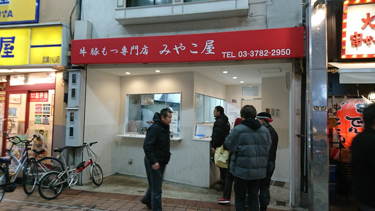 東急目黒線武蔵小山駅からパルム商店街を徒歩1分。武蔵小山の再開発にともない移転して、お店の屋号も「牛豚モツ卸問屋 みやこ屋商店」から「牛豚もつ専門店 みやこ屋」に変わりました。しかし、お肉の質、味は変わらず。メインは牛豚のもつの精肉店。営業時間は10時から19時ではありますが、もつ焼きか食べられるのは16時から。もつ焼きが始まると、持ち帰りがメインですが、お店の前での立ち食いも可能。お酒の持ち込みができなくなったので、長居はできませんが、熱々のもつ焼きをその場で食べることも可能。炭火で焼いた串はタレに漬けたあと、大きなトレーの中に。甘辛い匂いがたまりません。メニューは「しろもつ」「はつ」「レバー」「たん」「なんこつ」「かしら」の六種類。甘辛いタレが秀逸で、ホルモン特有の臭いはありません。なんと言っても嬉しいのは、どれも一本80円!持ち帰りの列はどんどん延びます。しろもつは甘いタレの焼き香ばしい香りと、グミグミ感がたまりません。レバーは臭みなし。はつやたんは食べごたえがあり、なんこつはコツコツ感が美味です。