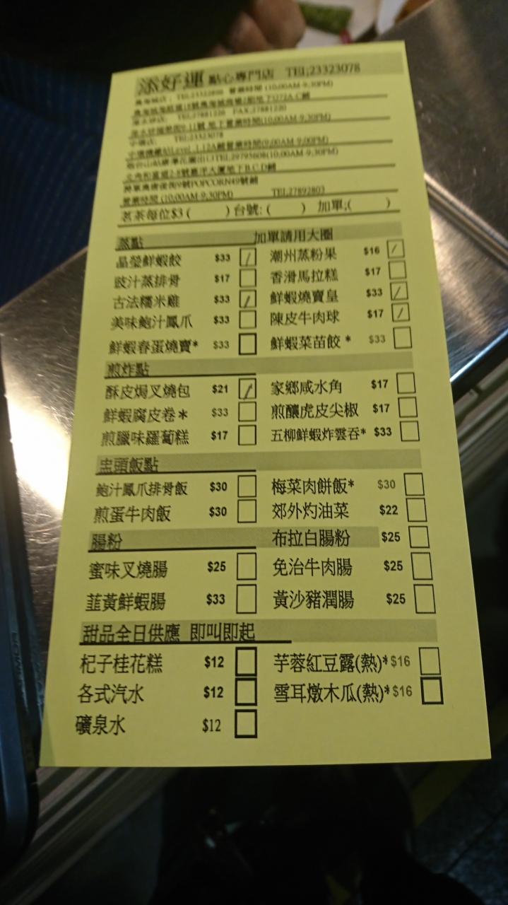 香港駅のin city check inの下にあるショッピングゾーンにあるお店。場所は結構分かりにくいところにあり、結構迷います。ミシュランで星を獲得したにもかかわらずリーズナブルなお店。そのため並びますが、メニューが多くないので回転も早く、そう長くは並びません。評価はいろいろあるようですが、価格、内容を見ればかなりレベルは高いと思います。チャーシュー入りメロンパンは、表がサクサクですが、チャーシューの味とのコラボは初体験でありながらも日本人に合う、中華と西洋のコラボ。餃子はサクサクした具の食間が最高。エビ餃子、シュウマイは、具がプリプリしていました。鶏を蒸したご飯は、味付けがちょうどよく、もち米の甘さとぴったりあっていて美味でした。結構食べても1500HK$くらいなのでかなりリーズナブル。敷居の低いミシュラン店だと思います。
