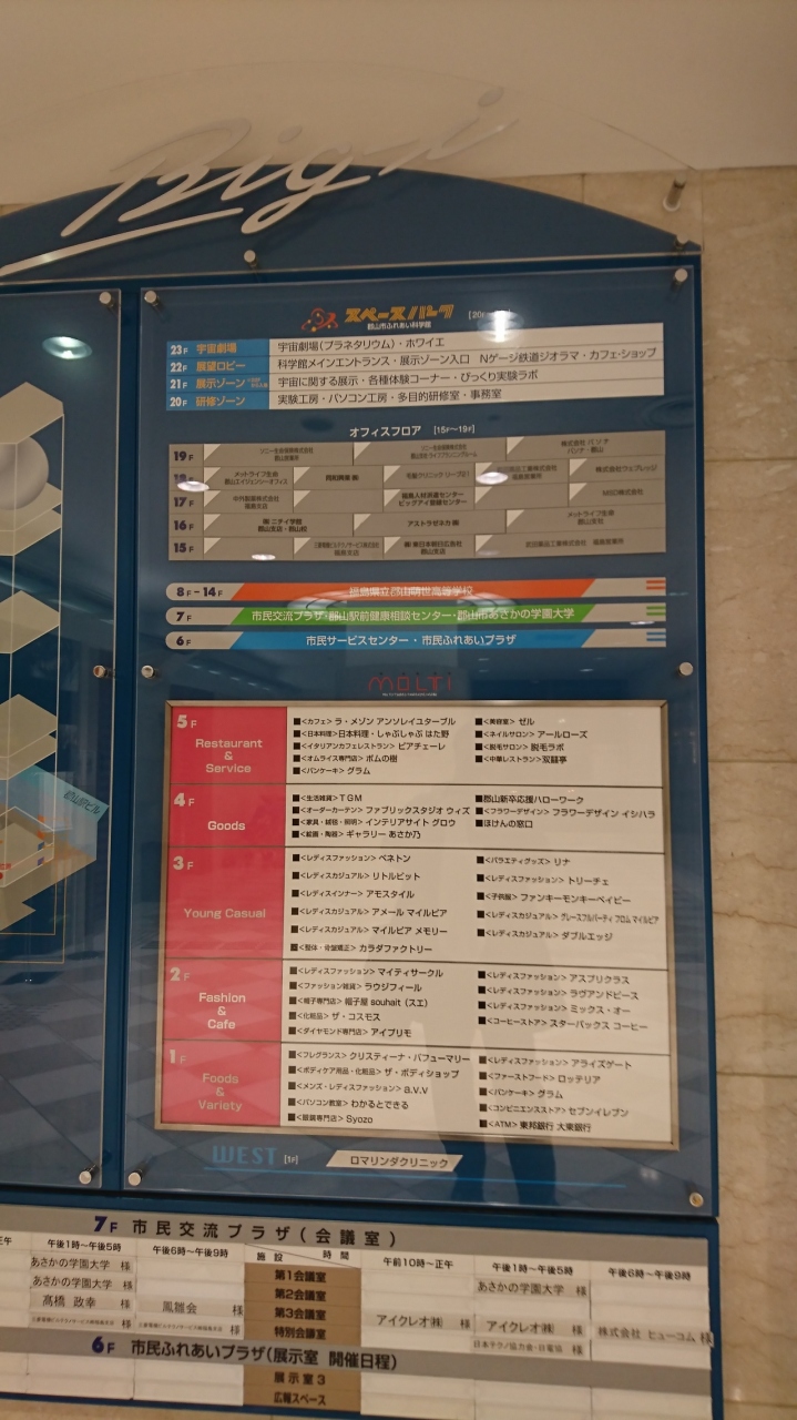 郡山駅西口に立つ24階建ての高層ビル「ビッグアイ」の商業施設。ビッグアイは福島県内で最も高い建物とのこと。1階~5階がモルティで、その上は市の施設や高校、大学のサテライトキャンパス、オフィス。基本的には地元向けのビルですが、ファッションや雑貨店などが多いので、新幹線の時間までの時間潰しには使えます。また、5階にはレストラン、2階にはスタバ(駅構内にもありますが)があり、スタバは7時半から殺っているので出張の時には重宝しています。
