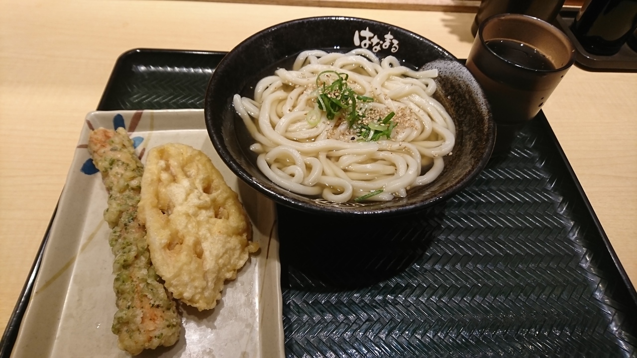 池袋に4軒あるはなまるうどんの内の一つ。他のお店が地下なのに対してこちらは地上。ビルの2階にあります。雑居ビルの細い階段を登っていくとお店で、すれ違いをするにはやや狭いかも。テーブル席とカウンター席の構成は他のはなまるうどんと変わらず。入るとすぐ、麺の量を聞かれて、そのあと天ぷらを取るのも、最後に会計のシステムも同じ。女性のお客さんも結構多い気がしました。かけうどん(中)とちくわの磯辺揚げ、れんこん天で450円と、本場で食べる価格とそう変わらないところが嬉しい。ちなみにかけうどん小は130円。写真の中は230円。