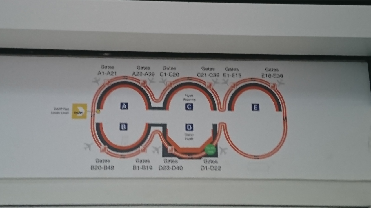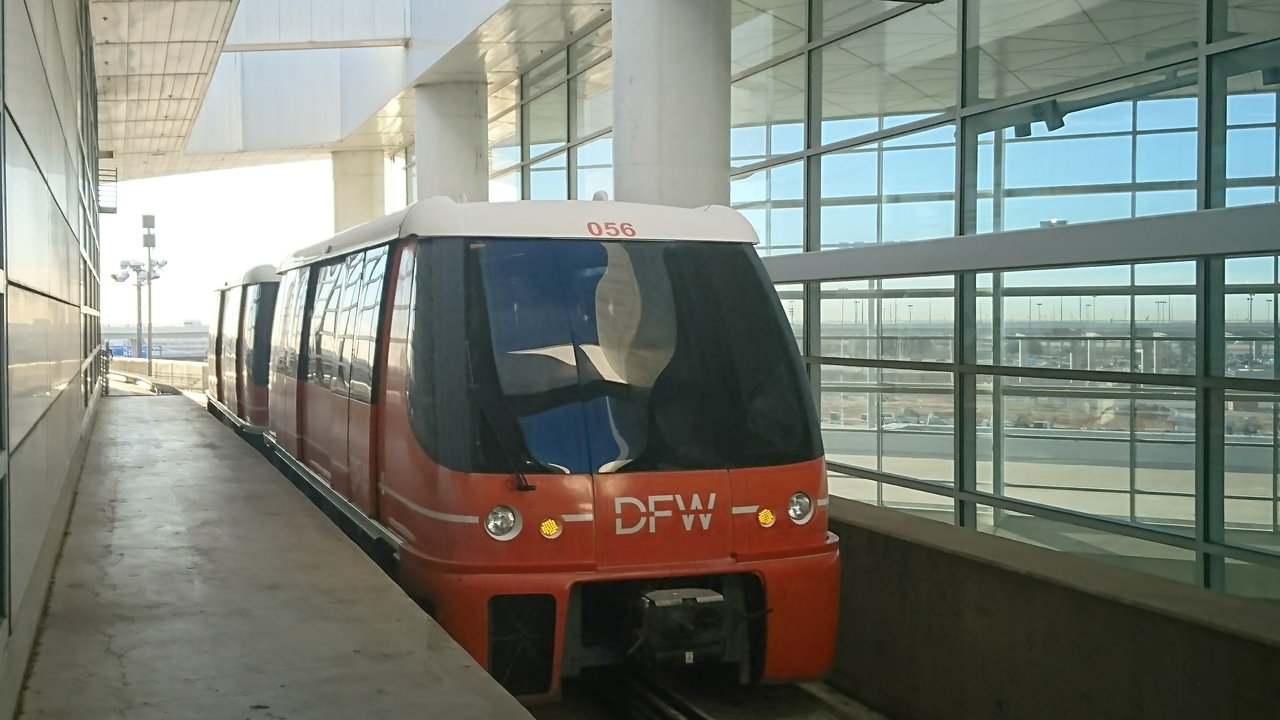 総発着数世界3位、旅客運送6位のダラス・フォートワース空港は、ターミナルがA~Eの5ヵ所あり、日本をはじめ国際線はDターミナルに発着。米国国内線はその他のターミナルになります。JALやAAで日本から直行便のないアメリカ各地に向かうには、AAのハブ空港であるダラスでの乗換が多く、フライト数も多いので便利。この乗換の際は、スカイリンクを利用します。2分ごとに運転されているので待たずに乗れます。また、時速50~60キロで走るので、イライラしません。外回りと内回りがありますが、どちらかにのれは目的のターミナルに着くので便利。一つのターミナルには40近くの搭乗口があるので、それぞれ二つの駅があって、近い搭乗口の駅で降りるのが便利。また、ターミナルの構造から、外回りはA→C→E→D→B→Aのそれぞれターミナル、内回りはその反対のターメリックの順に走ります。