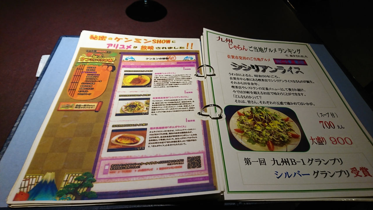 佐賀玉屋近くのビルの地下にある古めの喫茶店で、奥が禁煙席、前方が喫煙席。オムライスやガパオライス、カレー、一般の喫茶店メニューもありますが、オススメはリピート率ナンバーワンという「シシリアンライス」。シシリアンライスとは、昭和50年頃から佐賀市内の飲食店で出されるようになったご当地グルメで、味付けしたお肉とサラダが乗ったご飯の上にマヨネーズがかけてあるもの。見た目は沖縄のタコライスですが、味はかなり異なり、甘口の牛肉と酸味のきいたドレッシングのかかったサラダという、主張し合う二つのメニューが、温かいご飯の上で調和して、一つの完成品になっているという印象。レンゲで食べます。よみうりテレビの「ケンミンショー」でも紹介されたお店です。