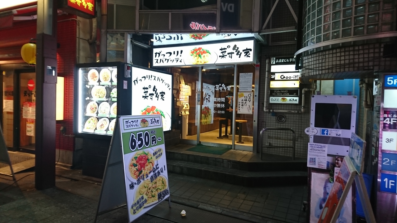 御徒町駅から仲通りに入りすぐ。カウンター席のみのお店です。あらかじめパスタは茹でてあるようで、食券(食券機で買います)を店員さんに渡すと、パスタの量を図ってフライパンで炒めてくれます。がっつりメニューで、一番の大盛りは750gの「B級グルメとり塩炒め特盛」。750円なのでかなりコスパがよいかと。ナポリタンの大盛り750円を注文。最初は酸味が強いなと思いつつ、食べ進むと少し塩味が濃い。パンチョのケチャップ味とはかなり違い、そこは評価の分かれるところだと思います。麺は中太で、茹で方も少し固め。ボリュームを求める方におすすめ。