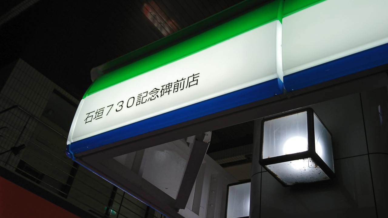 730記念碑のある交差点前にあり、お隣はA&Wという立地。石垣島には本土資本のコンビニは、地元りうぼうグループとの合弁のファミリーマートの独占状態なのですが、品揃えは沖縄本島、本土と遜色ありません。沖縄のファミリーマートなら必ず売っているブルーシールアイスクリームや地元の八重山ゲンキ乳業のゲンキクールも売っています。離島へ行く場合のフェリーターミナルには売店かお土産店しかないので、一番フェリーターミナルに近いコンビニでもあります。