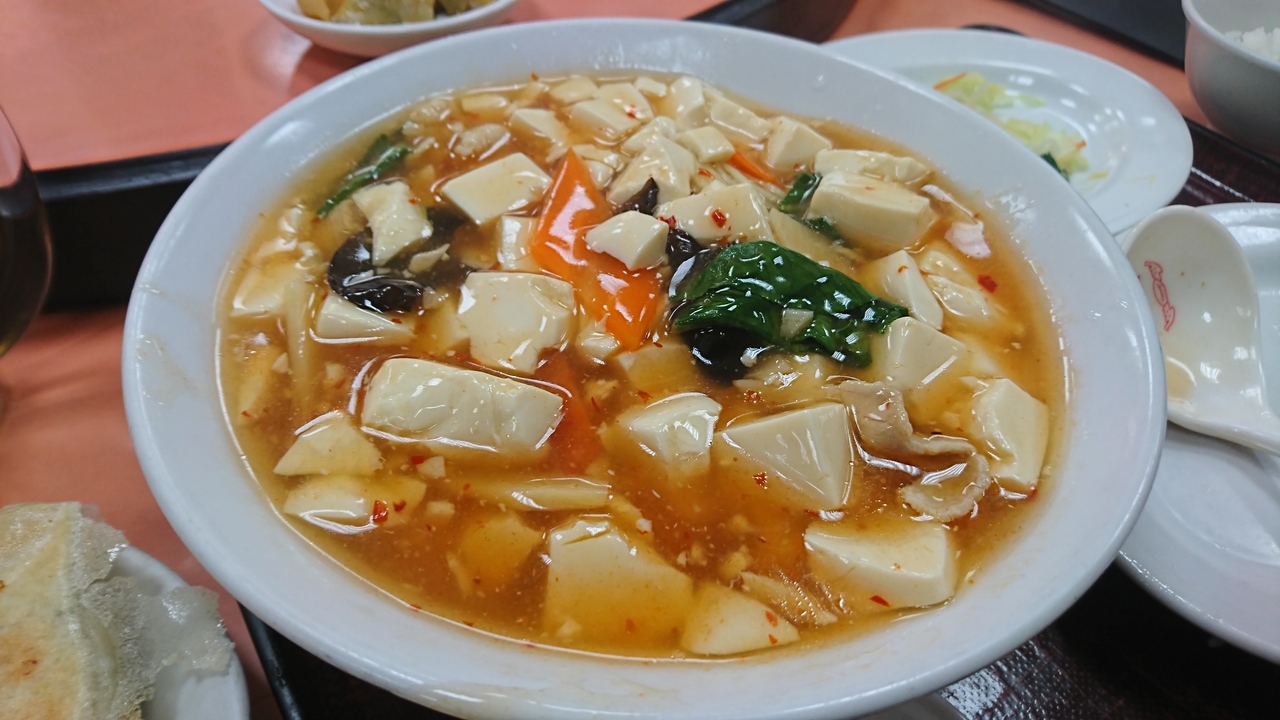 JR蒲田駅から徒歩5分くらい。大田区役所の先にあります。ランチはリーズナブルで、ランチセットは5種類あり、700円のセットが4種類、もう一つが塩ラーメンと餃子、ライスのセットで500円とかなりリーズナブル。餃子は餡が大きく肉汁がたっぷりで、ランチセットは3つ入りなので一人前を追加オーダー。羽根の食感もよいです。麻婆ラーメンは、シンプルな醤油ラーメンに麻婆豆腐がのっているもので、これがピリ辛でご飯が進みます。ただし、ラーメンとのセットの場合、餃子とラーメンが同時に出てくることは希です。
