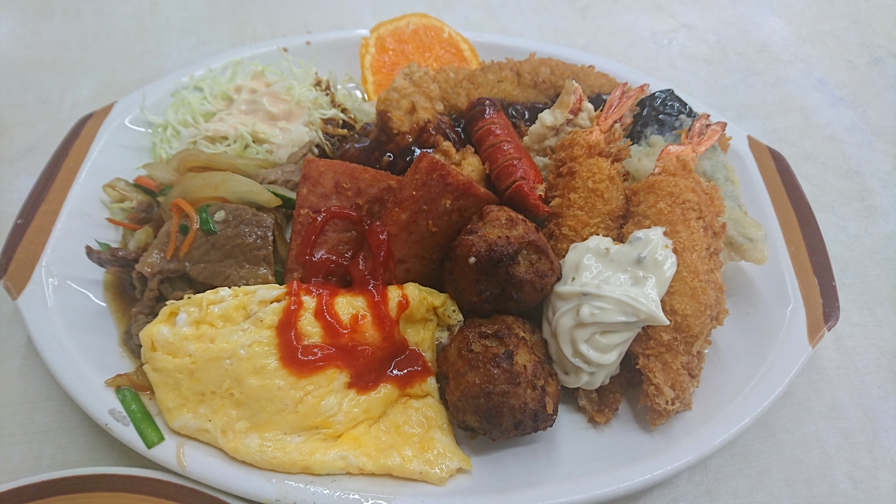 桟橋通りバス停から300メートルくらい。少し大きめの地元の定食のお店という印象。沖縄には多いタイプの感じ。15時過ぎに行きましたが、結構お客さんが入っていました。地元の人気店。メニューを決めて入店するお客さんも多いようです。一番ボリュームがあるのはなんと言っても「Aランチ」。エビフライ、肉団子、ポーク玉子、焼き肉、唐揚げ、トンカツ、魚の天ぷら、なす天、ウインナー、沖縄そばのにご飯大盛り。しかも、どれもしっかり味がついていて美味。さすがにこちらは1200円しますが、1000円を超えるのはこのメニューくらいでコスパはかなりよいです。家の近くにあったら毎日通ってしまいそうなお店です。