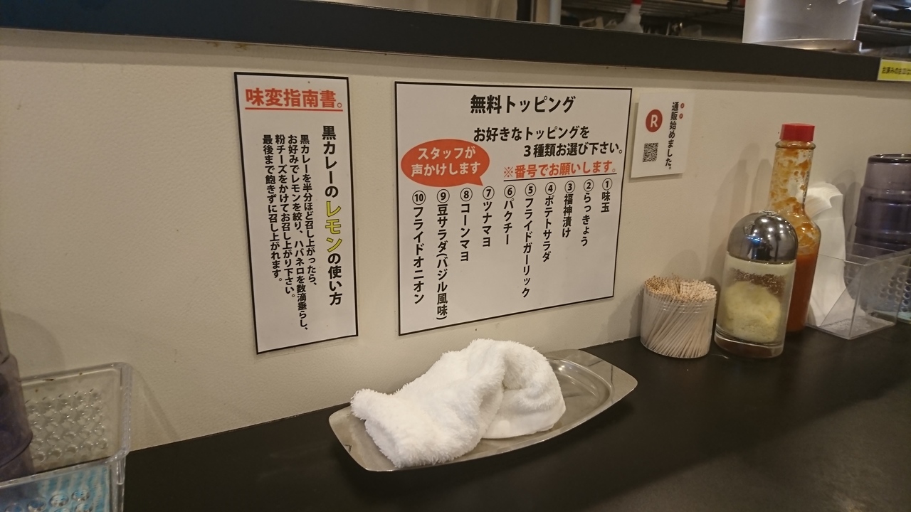 御徒町駅から徒歩3分くらい。中央通りを秋葉原方向から歩くと松坂屋、PARCO yaの手前の細い道を曲がったところの小さなビルに小さな入口。縦に細長いカウンターだけのお店。池袋のお店のように大通りには面していません。しかし、ランチ時は結構、混雑。メニューは定番の「黒い肉カレー」「赤い鶏カレー」に加え、甲府とこちらにしかない「牛かつカレー」、秋葉原とこちらにしかない「激辛鶏のチリチリカレー」がある。ごはんが小盛り(200g)から山盛り(500g)までの4種類。値段が同じなのがうれしい。トッピングも3種類無料!限定カレーにするか迷いましたが、やはりいつも頼む黒い肉カレーを注文。ホテルで食べているような上品な味のカレーは、お店の雰囲気とは全く合いませんが、美味で気品があります。レモンとハバネロをかけると味変し、また美味。次は、限定カレーも食べてみたいと思うのですが、きっと黒い肉カレーかな。