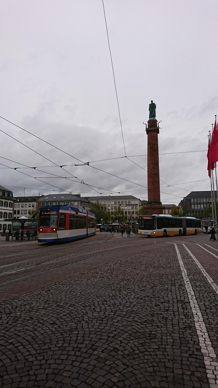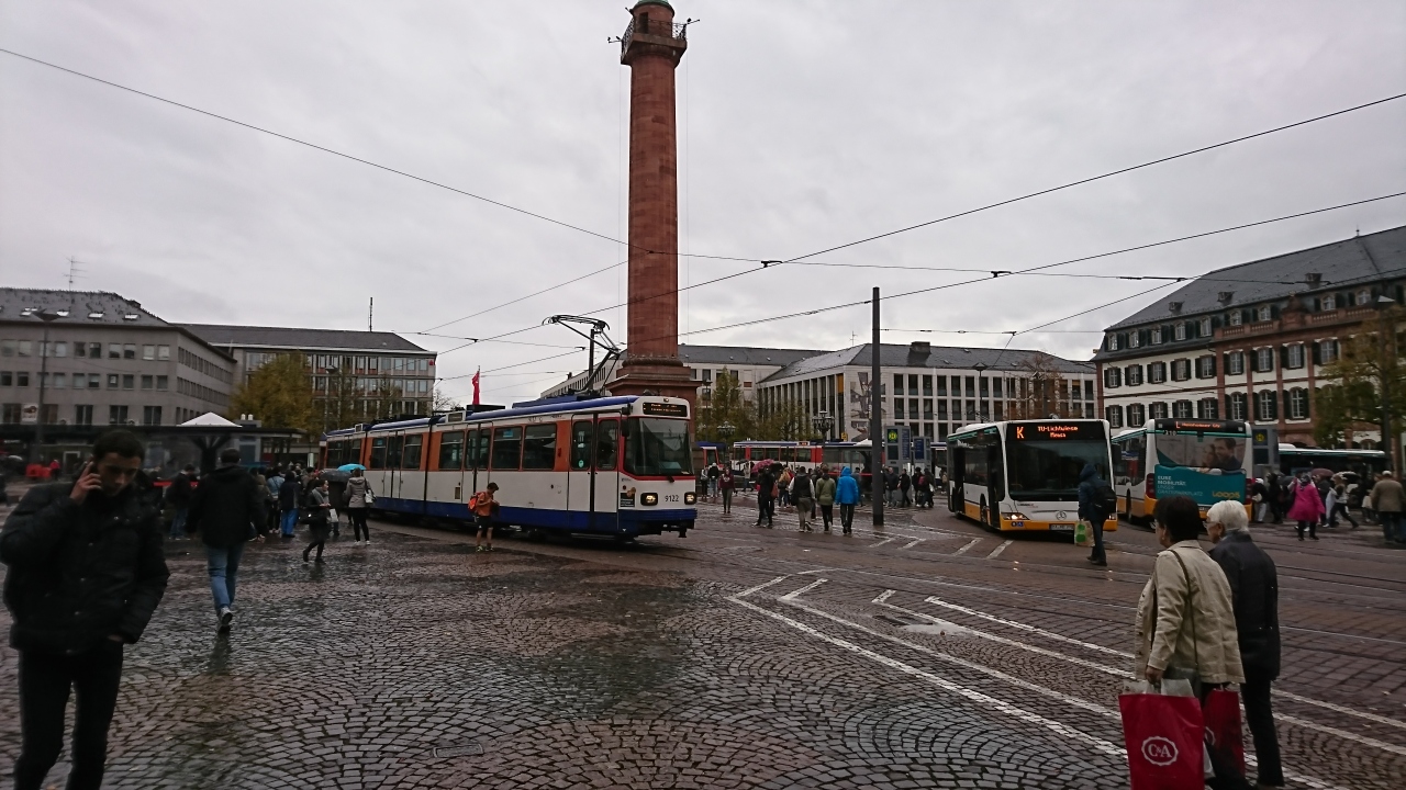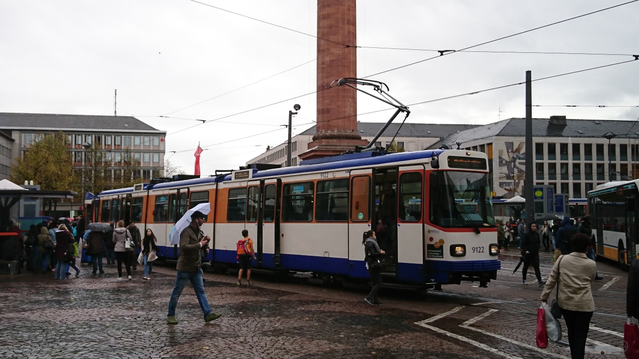 フランクフルト空港から25km。ヘッセン州に9つある上級中心都市の1 つでもあるダルムシュタットの中心部。広場の中心にあるルートヴィヒ記念碑を中心にトラムや市内バス、フランクフルト空港への「エアバス」の発着。郵便局やレストラン、カフェ、正面にはLuisen Center、Kaufhofなどさまざまなショップが軒を並べています。ダルムシュタットで最も栄えた場所であり、トラムやバスはひっきりなしに行き交っています。ちなみにルートヴィヒ記念碑とは19世紀中期のヘッセン大公 ルートヴィヒ1世の像です。観光する場合はここからスタートすればよいでしょう。